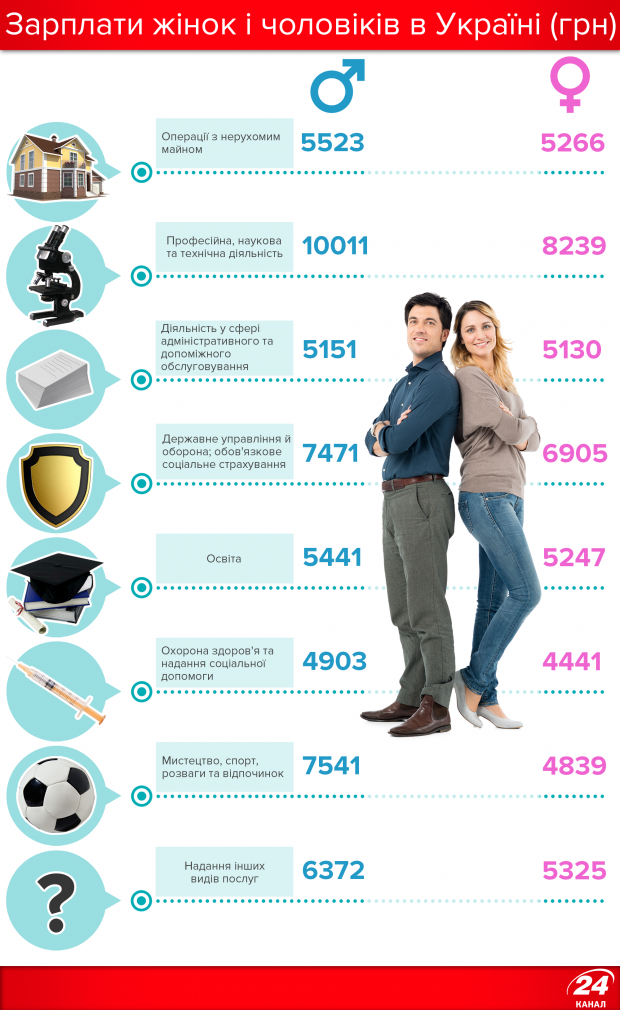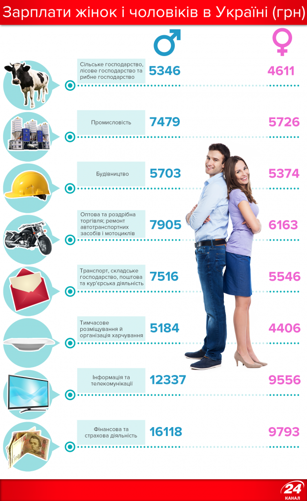 Так, наприклад, найбільша різниця – у сфері фінансової та страхової діяльності. Чоловіки в цій галузі заробляють в середньому до 16 118 грн, жінки – до 9 793 грн. Чоловіки-науковці заробляють близько 10 тисяч грн, жінки – 8 239 грн. Також великий розрив у розмірі зарплат за статтю є у сферах мистецтва, спорту, розваг та відпочинку (чоловіки – 7 541 грн, жінки – 4839 грн), інформації та телекомунікації (чоловіки – 12 337 грн, жінки – 9 556 грн), транспорту, складського господарства та кур'єрської діяльності (чоловіки – 7 516 грн, жінки – 5 546 грн), а також у промисловій галузі (чоловіки – 7 479 грн, жінки – 5 726 грн).
