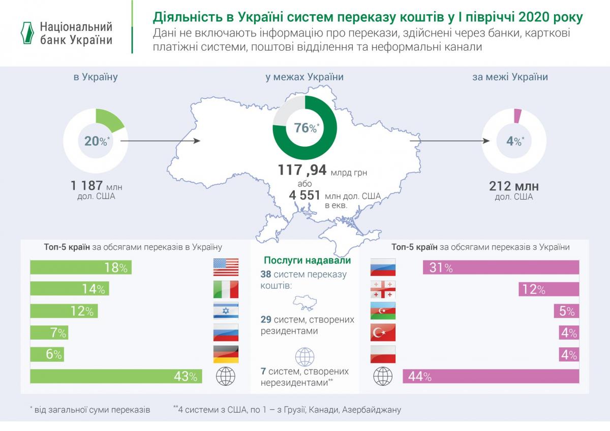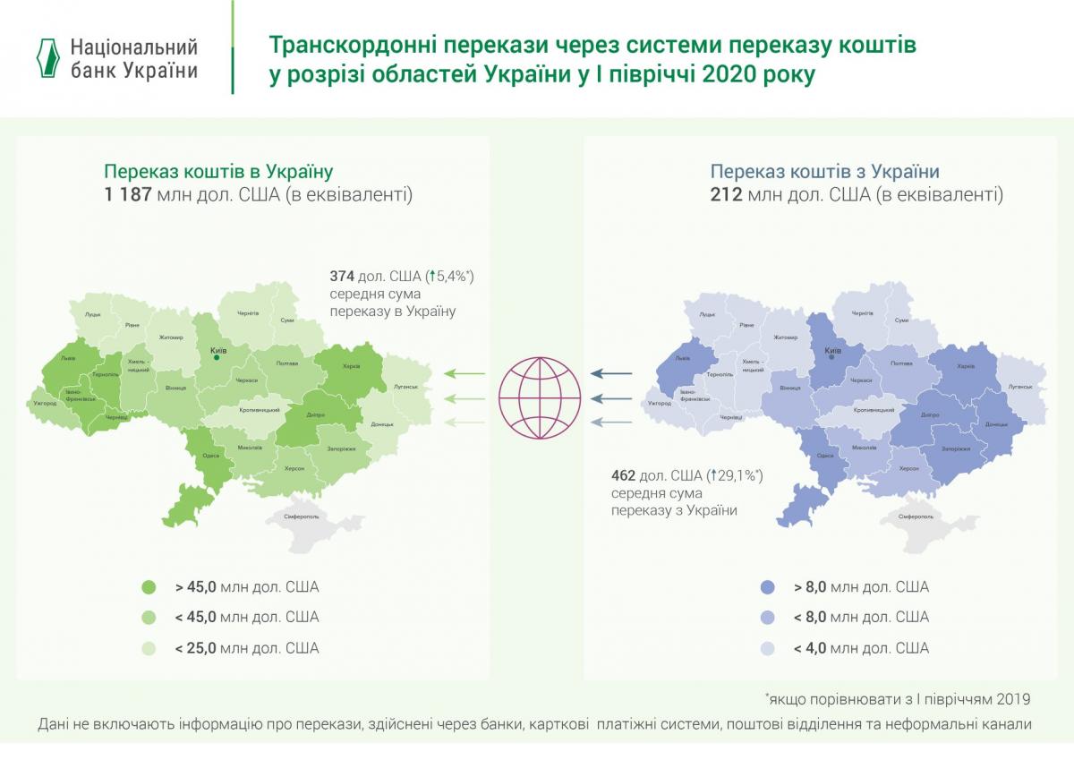 За попередніми оцінками Національного банку України, у січні – червні 2020 року обсяг приватних переказів офіційними та неформальними каналами становив: в Україну з-за кордону – 5 365 млн дол. США в еквіваленті; з України за кордон – 246 млн дол. США в еквіваленті.