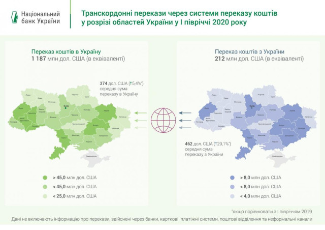 - 212 млн дол. США у еквіваленті надіслано за кордон через системи переказу коштів. У порівнянні з аналогічним періодом 2019 року обсяги зросли на 26,2%. Цей найпопулярніший спосіб забезпечив понад чотири п’ятих від усіх приватних переказів з України. На 29,1% зросла і середня сума одного переказу з України: 462 дол. США у порівнянні із 358 дол. США у першому півріччі торік.Звідки надходять кошти