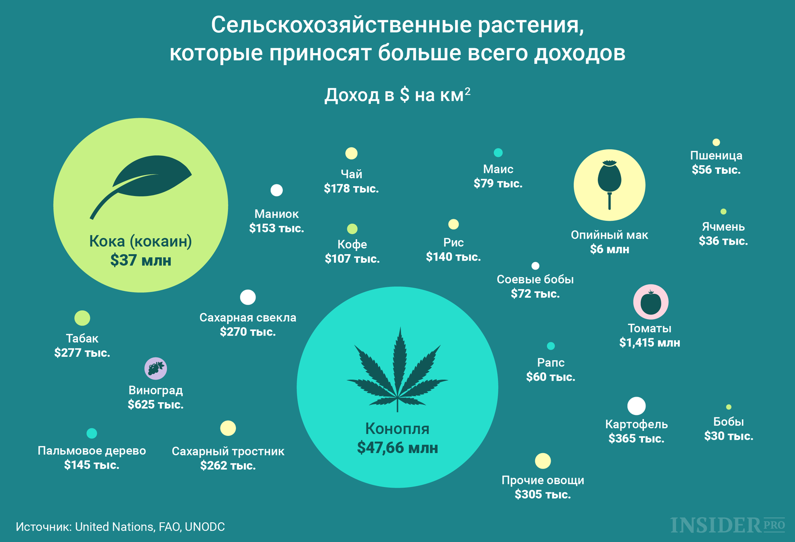 Відповідно даним United Nations, FAO та UNODC, з квадратного кілометра конопель можна зібрати 47,7 млн дол., аналогічна площа коки дасть 37 млн дол., а опіуму — 6 млн дол.