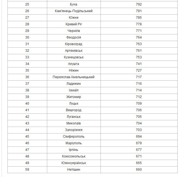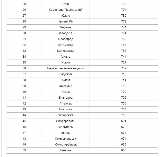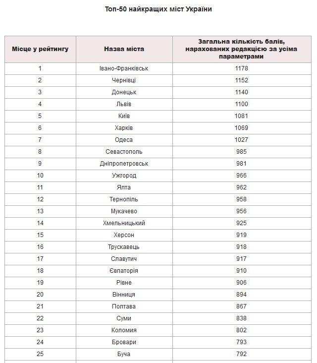 За кожним із параметрів місту присуджується сума балів від 0 до 50. Далі відбувається ранжування міст.