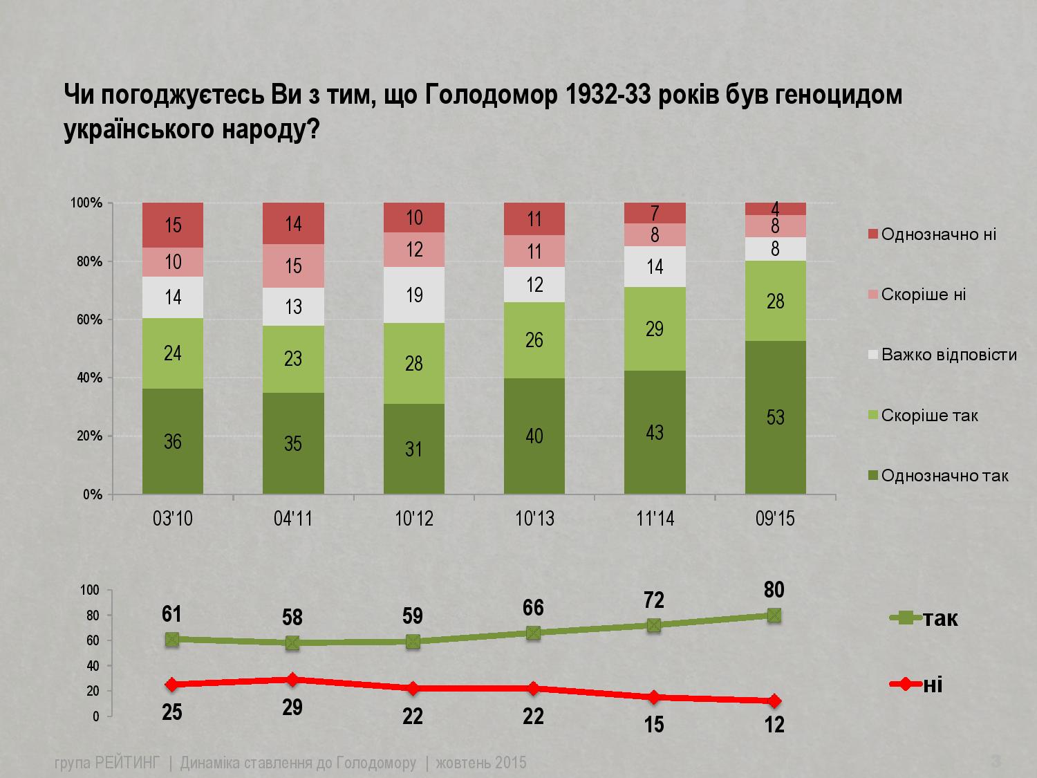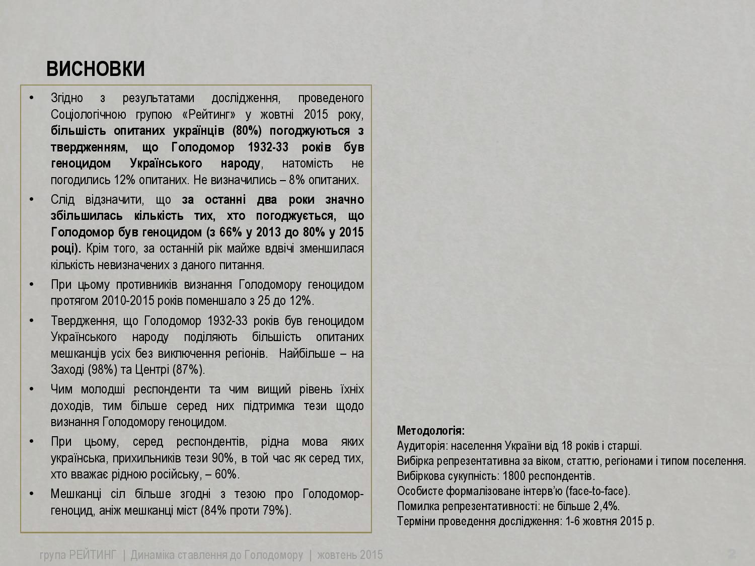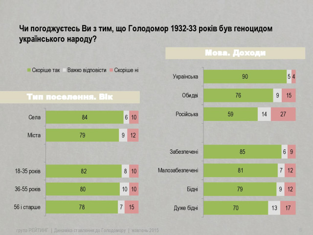 Слід відзначити, що за останні два роки значно збільшилась кількість тих, хто погоджується, що Голодомор був геноцидом (з 66% у 2013 до 80% у 2015 році). Крім того, за останній рік майже вдвічі зменшилася кількість невизначених з даного питання.