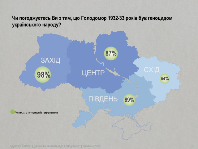 Твердження, що Голодомор 1932-33 років був геноцидом Українського народу поділяють більшість опитаних мешканців усіх без виключення регіонів. Найбільше – на Заході (98%) та Центрі (87%).