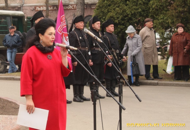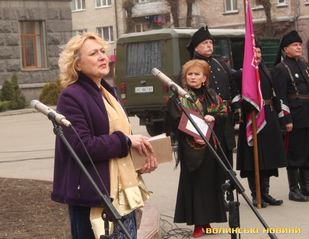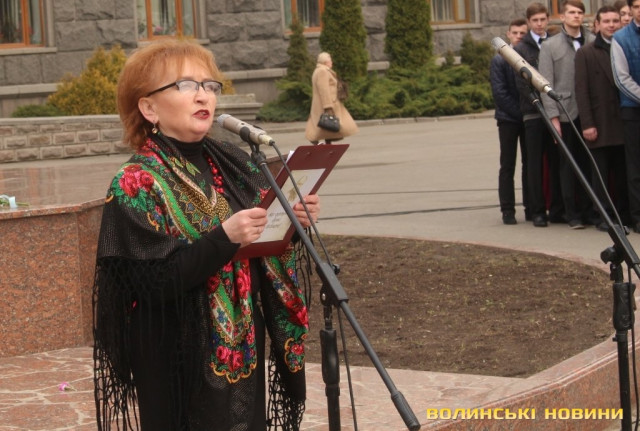 Вона наголосила, що 9 березня - важлива дата для кожного українця, адже саме в цей день народився великий син нашого народу, Тарас Шевченко. Він став поетом, якого ми ще не мали, поетом народу, поетом пригноблених, але нескорених. Народжений матір’ю-кріпачкою, сам кріпак, він став борцем, революціонером титанічної сили, якого боялися царі, жахалися і ненавиділи кріпосники. Будучи відірваним від України у муштру і солдатчину, з яких, здавалося, ніколи не буде вороття, Тарас Шевченко повернувся вогненною піснею, віщим незборним словом, бо душа поета увібрала в себе весь волелюбний дух українського народу. Невипадково його називають українським пороком, адже його слова, якими він промовляє зі сторінок «Кобзаря» є дійсно пророчими.Як зауважила Людмила Стрільчук, його слово нині звучить на східних фронтах України, з його словом йшли на смерть та на барикади під час української Революції Гідності не лише українці. Так, Сергій Нігоян за день до смерті цитував Шевченкові слова «борітеся - поборете, вам Бог помагає, за вас правда, за вас слава і воля святая». Вона відзначила, що у великій людській скарбниці є ті книги, які мають заповітне значення для народу і саме такою книгою для українців став «Кобзар». Тарас Шевченко є символом України, тому що кожне нове покоління перечитує «Кобзар» як Святе Письмо, як книгу правди і мудрості.