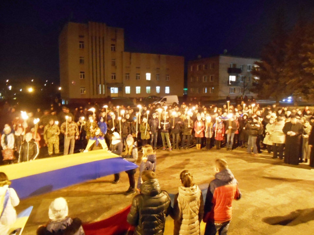 Традиційно, як і будь-які заходи, розпочали з молитви біля хреста-пам"ятника, потім громада вишикувалася в колону та всі запалили смолоскипи. Так і пройшлися по головних вулицях міста, вигукуючи гасла: "Крути, Крути! Вас не забути", "Слава Україні!", "Героям Слава" та інші, - повідомляють організатори.