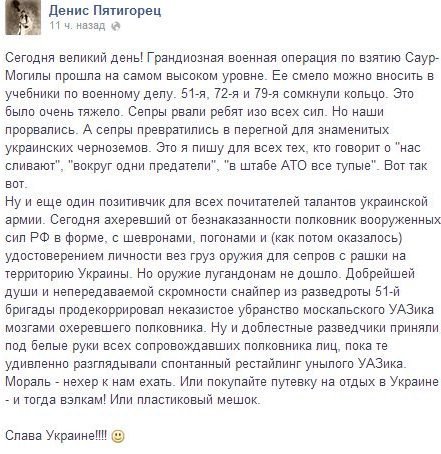 "Сегодня великий день! Грандиозная военная операция по взятию Саур-Могилы прошла на самом высоком уровне. Ее смело можно вносить в учебники по военному делу. 51-я, 72-я и 79-я сомкнули кольцо. Это было очень тяжело. Сепры рвали ребят изо всех сил. Но наши прорвались. А сепры превратились в перегной для знаменитых украинских черноземов. Это я пишу для всех тех, кто говорит о "нас сливают", "вокруг одни предатели", "в штабе АТО все тупые". Вот так вот.