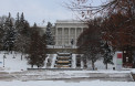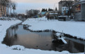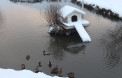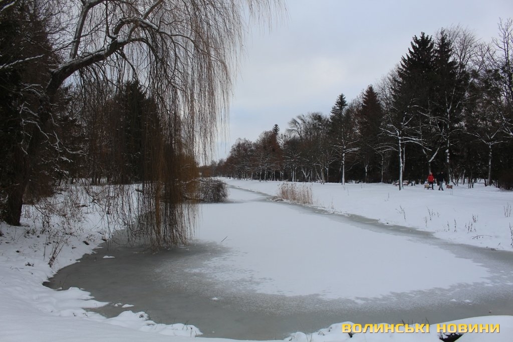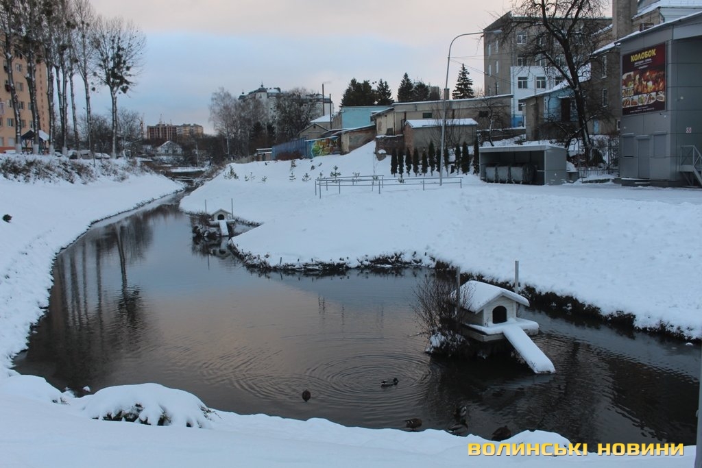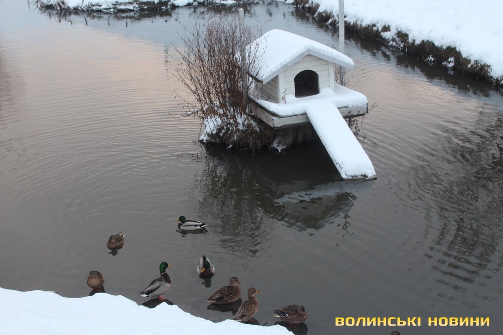 Величні архітектурні будинки, ніби втрачають серйозність у снігових капелюхах, а сухоцвіти, мов блазні королівського двору, схиляють голови, тріскочучи віттям. А що вже говорити про качок, які вочевидь так загрались на ставку, що, певно, забули про родичів, які давно відлетіли у теплі краї. Бавляться собі пернаті на водоймі, та з радістю зустрічають перехожих, які підгодовують їх хто чим може.