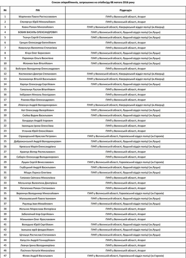 Наразі опублікований СПИСОК працівників поліції, запрошених на співбесіду 8 лютого 2016 року: