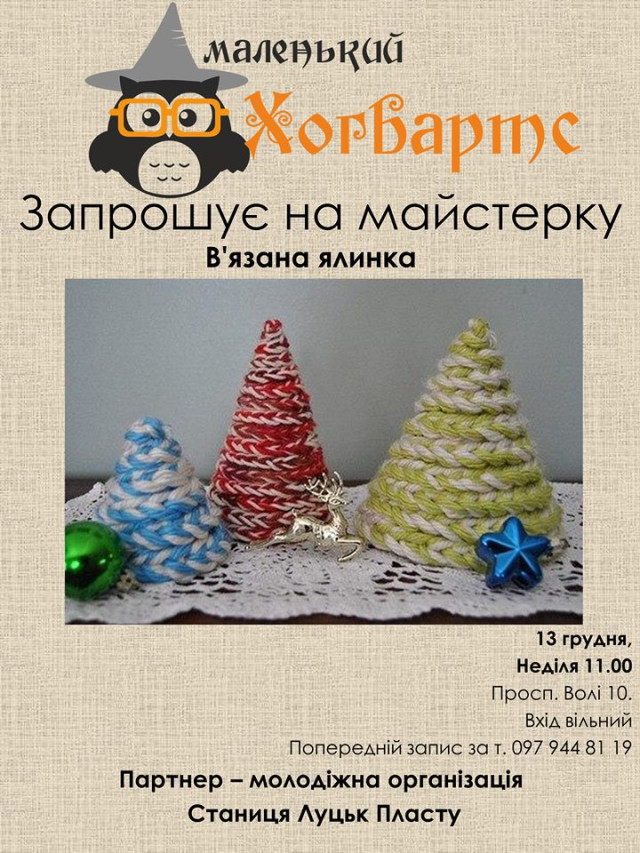 «Маленький Хогвартс» пропонує зробити разом з нами в'язану ялинку, яка зігріватиме вас своїм теплом та затишком протягом усіх новорічно-різдвяних свят. В рамках акції «Новорічні майстерки», партнером якої є Пласт, майстерка є безкоштовна. Також «Маленький Хогвартс» долучився до акції зі збору речей для Затурцівської школи-інтернату, тому ми будемо вдячні за книжки, пазлики, канцелярку, які можна передати для вихованців цієї школи», – йдеться у дописі.