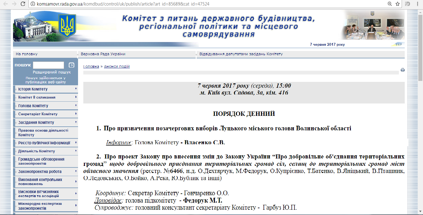 Так, у порядку денному Комітету питанням номер один стоїть «Про призначення позачергових виборів Луцького міського голови Волинської області». І цей факт абсолютно суперечить сьогоднішнім заявам народного депутата Любомира Зубача («Самопоміч»). Зокрема, він повідомив, що працює в комітеті з питань державного будівництва та за станом на ранок 7 червня жодного листа не зареєстрували (він, мовляв, дзвонив у секретаріат комітету).Нагадаємо, сьогодні нардеп Любомир Зубач був присутній на виконкомі Луцької міськради разом із екс-секретарем міськради Юлією Вусенко. Він зробив кілька голослівних заяв із своєю однопартійкою і після цього покинув приміщення Луцькради.