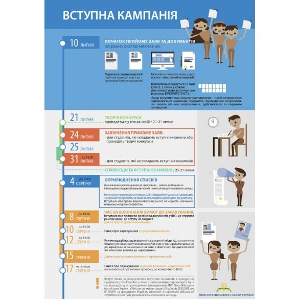 У допомогу абітурієнтам Міносвіти опублікувало інфографіку з описом основних етапів вступної кампанії 2015 року, де абітурієнти зможуть ознайомитися з термінами подання заяв, співбесід та екзаменів, оприлюднення списків та інше.