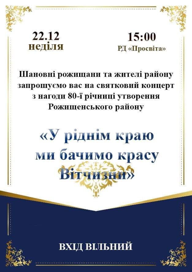 Святкування з нагоди 80-річниці утворення Рожищенського району відбудуться у неділю, 22 грудня, о 15:00 в Рожищенському РД «Просвіта».