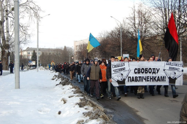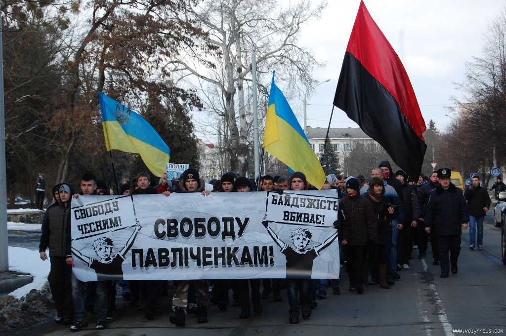 Рухаючись дорогою, люди тримали транспарант з написами «Свободу Павліченкам!», «Байдужість вбиває!» і «Свободу чесним!», українські прапори та стяги ОУН.