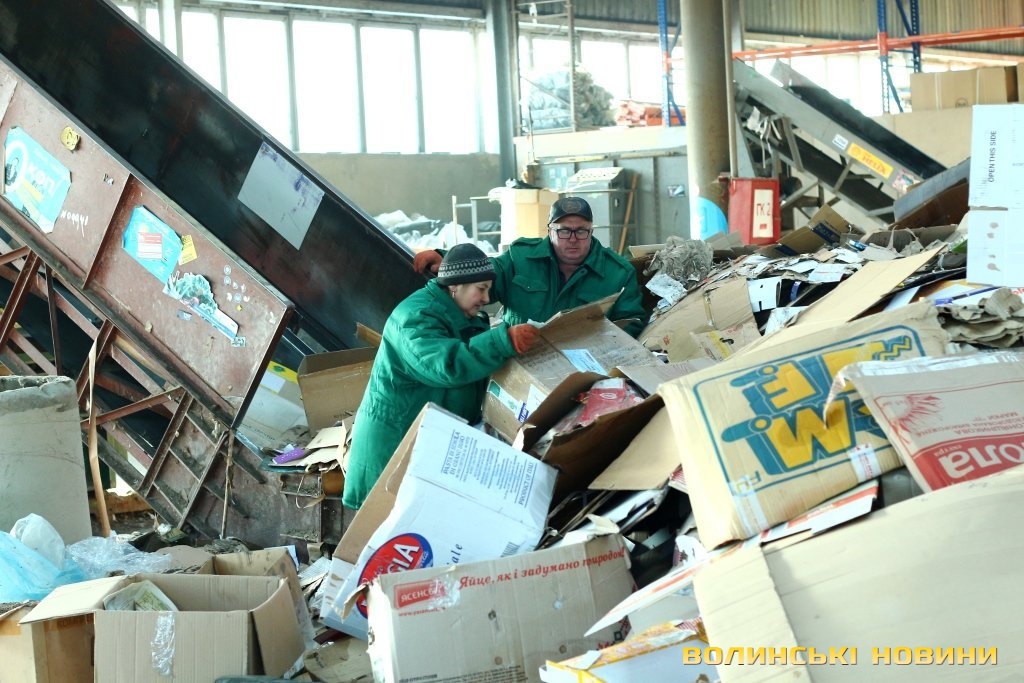Наразі на підприємстві працюють 11 осіб. Сортувальник Лариса Вознюк розповіла, що окремо сортують картон та папір. Щодня вдається посортувати приблизно п’ять тонн сміття. Потім його відправляють на переробку на ЛКПФ.