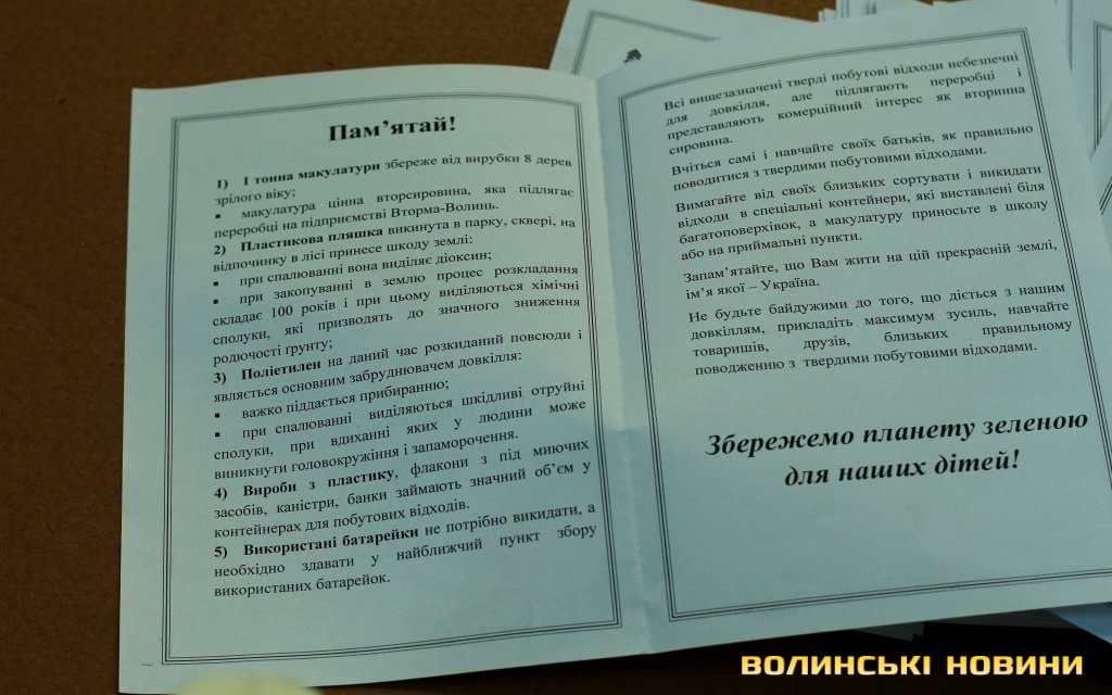 Луцьких школярів, учнів школи №22, яка належить до лідерів за обсягом збору макулатури, закликали не бути терпимим до тих, хто засмічує довкілля, навчати поводженню з твердими побутовими відходами своїх батьків та друзів. Кожен з учасників заходу отримав пам’ятку учня, у якій йдеться про поводження з макулатурою, пластиковими пляшками, поліетиленом, виробами з пластику тощо.Учням розповіли, що ПЕТ-пляшки є одними з основних засмічувачів довкілля, але є цінною вторинною сировиною для переробки. Ігор Ціж наголосив, що такі пляшки можна використовувати лише одноразово, адже вони згодом починають виділяти шкідливі речовини, що викликають утворення ракових клітин у людини.