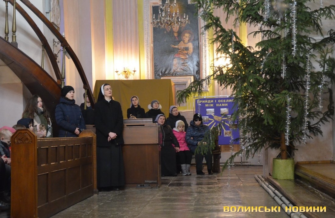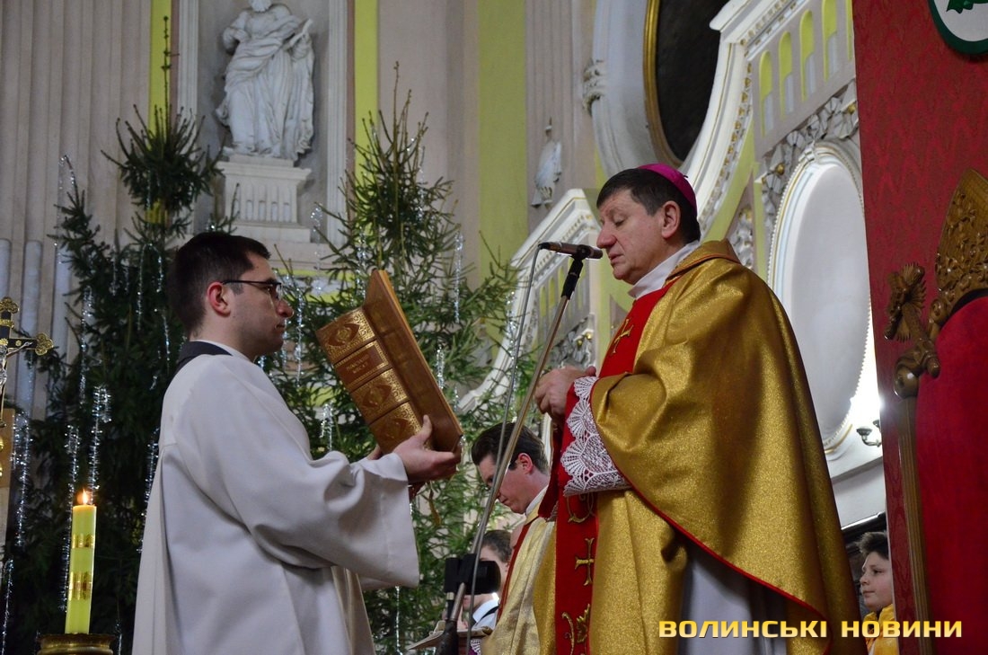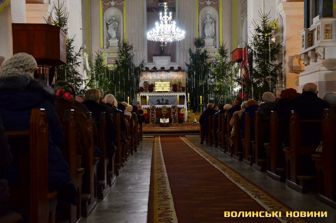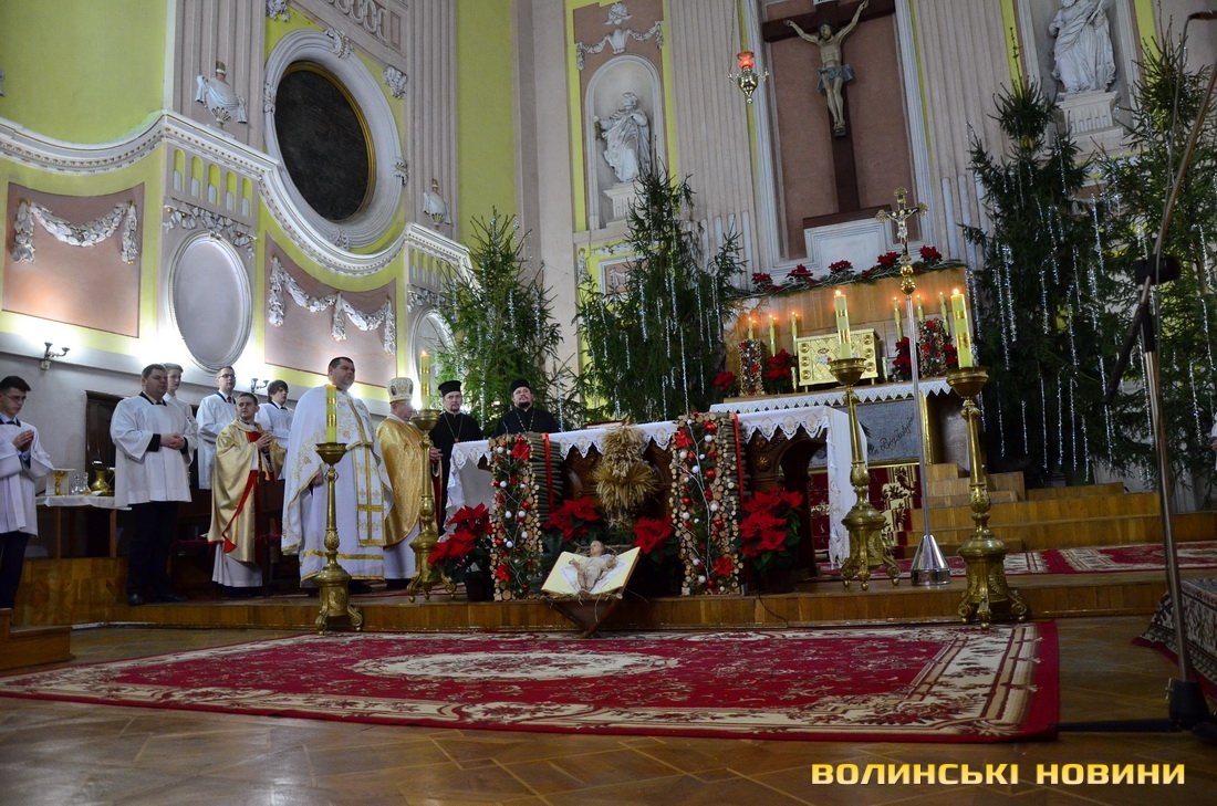 Урочиста меса відбулася зранку 25 грудня в кафедральному костелі Святих Апостолів Петра і Павла в Луцьку, який напередодні свят прикрасили живими ялинками та різдвяниками.