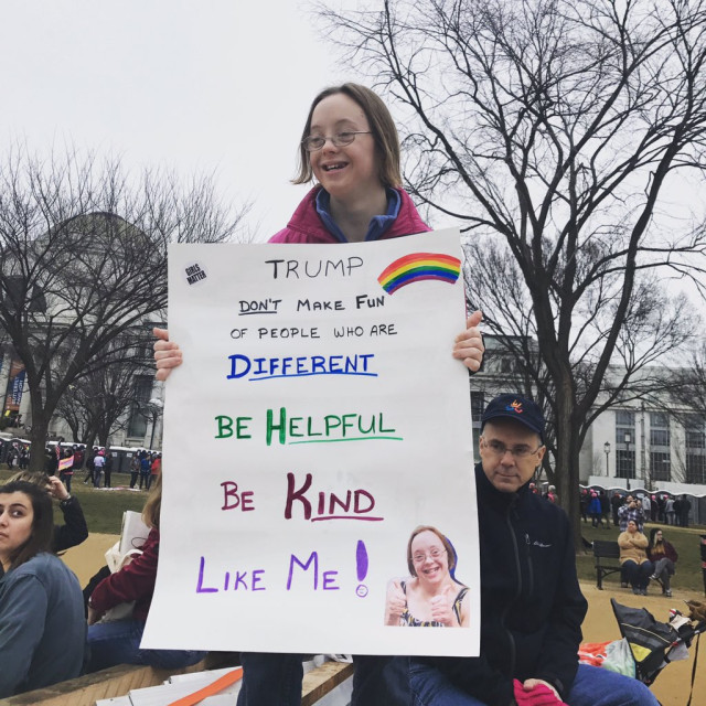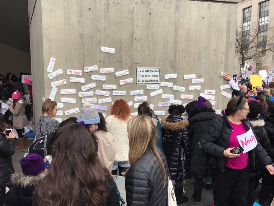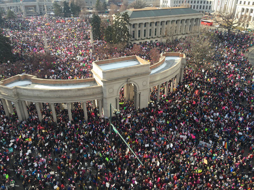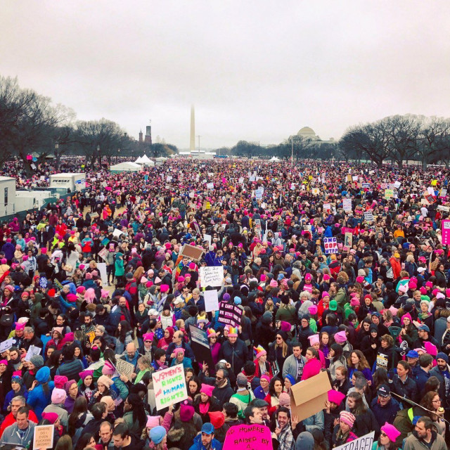 На головній демонстрації у Вашингтоні, округ Колумбія, спостерігаються великі натовпи жінок і чоловіків, що з’їхалися транспортом з різних регіонів країни. У багатьох демонстрантів – яскраво-рожеві капелюхи. Люди слухають виступи відомих особистостей, серед яких і зірки Голлівуду.
