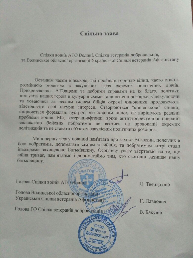 Підписалися під заявою голова Спілки воїнів АТО Волині Олег Твердохліб, голова Волинської обласної організації Української Спілки ветеранів Афганістану Григорій Павлович та голова ГО Спілка ветеранів добровольців Вʼячеслав Бакулін.
