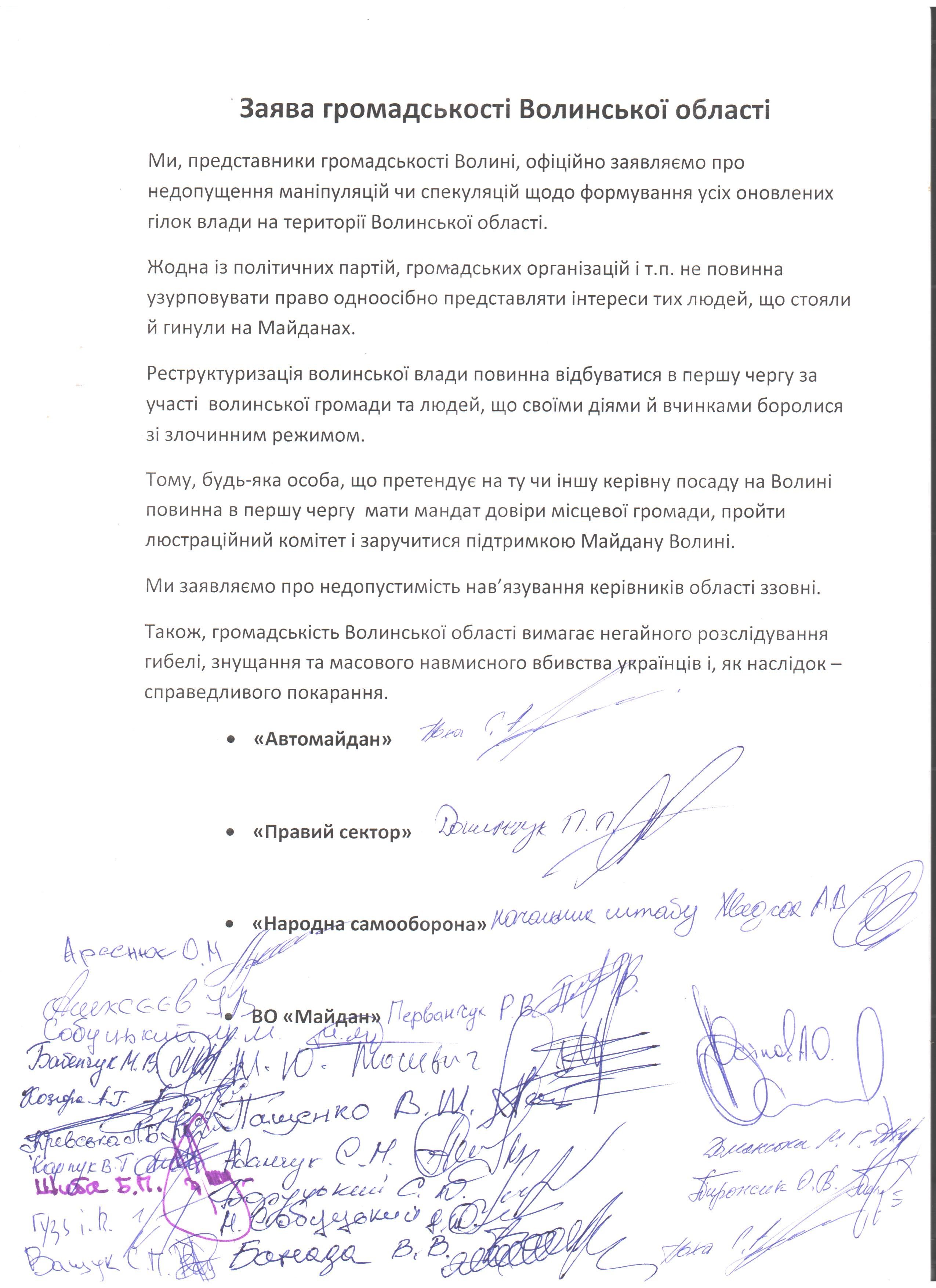 Також активісти переконані, що будь-яка особа, яка претендує на ту чи іншу керівну посаду в обалсті, повинна мати мандат довіри місцевої громади, пройти люстраційні комітети і заручитися підтримкою Майдану на Волині. Зокрема, вони заявляють і про недопустимість нав’язування керівників області ззовні.