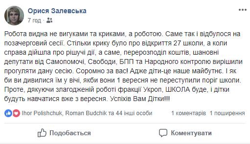 «З усією повагою до бійців АТО і з розумінням необхідності будівництва реабілітаційного центру було обрано найоптимальніший варіант, який не зашкодить будівництву центру і при цьому дозволить відкрити двері для майбутніх учнів довгоочікуваної школи». Натомість депутати фракцій «БПП», «Свобода», «Самопоміч» та «Народний Контроль», зі слів радника міського голови Ігоря Поліщука, саботували прийняття рішення, яке дозволить дітям розпочати новий навчальний рік в сучасній школі. За виключенням деяких осіб, фракції в повному складі не з’явились на сесійне засідання. Зокрема, не прийшов на сесію і депутат від «Самопомочі» Тарас Шляхтич, на окрузі якого і знаходиться школа.