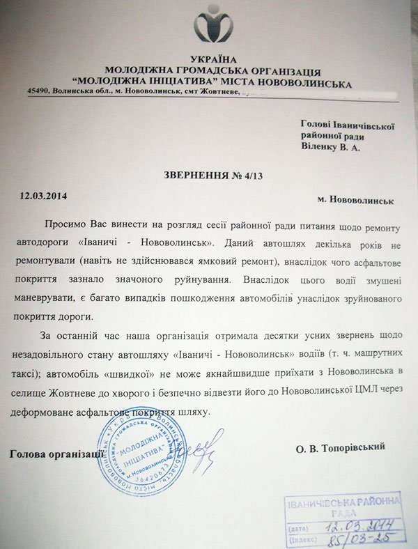 «Як бачимо «влада Януковича» нас не чула, чи не хотіла почути... Цього року МГО «Молодіжна ініціатива» написала звернення до голови Іваничівської районної ради, який пообіцяв винести це питання на сесію обласної ради, яка відбудеться завтра, 14 березня.