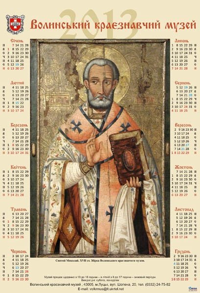 До Дня Святого Миколая Волинський краєзнавчий музей видав два календарі на 2013 рік із зображенням ікони «Святий Миколай» XVII століття. Ілюстрація - зі збірки музею.