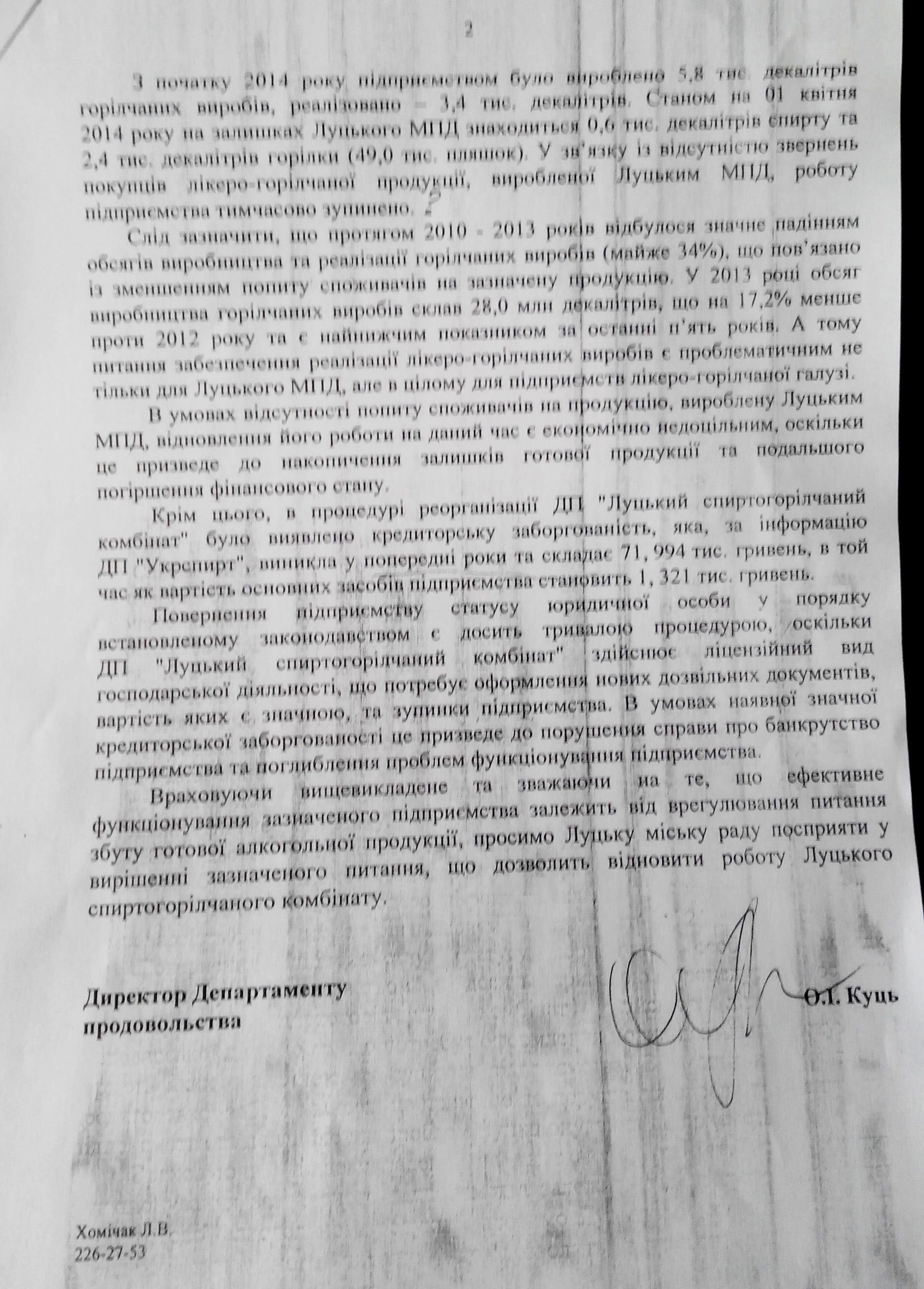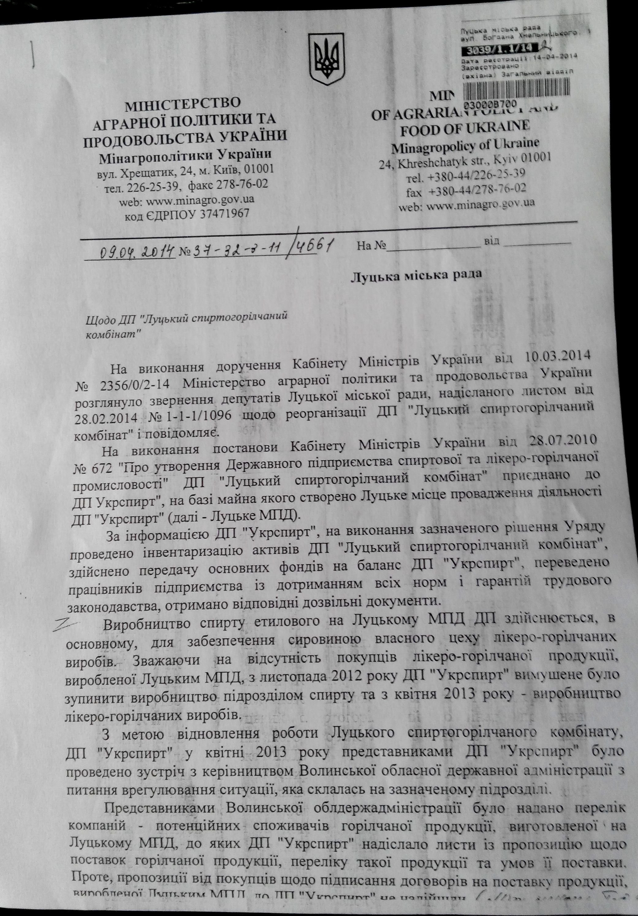 Проте відповідь зі столиці виявилася не такою, як сподівалися. В документі від Міністерства стверджується, що впав попит на лікеро-горілчані вироби, отож передбачаються проблеми з реалізацією продукту. Також «повернення підприємству статусу юридичної особи у порядку встановленому законодавством є досить тривалою процедурою, оскільки ДП «Луцький спиртогорілчаний комбінат» здійснює ліцензійний вид господарської діяльності, що потребує оформлення нових дозвільних документів, вартість яких є значною».