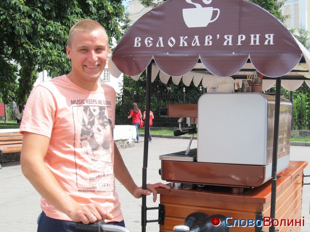 Продавати каву на вулицях Луцька Роман вирішив приблизно два роки тому. Починав із автокав’ярні, але згодом із чотирьох коліс пересів на три, запозивши ідею з велокав’ярнею у львів’ян.