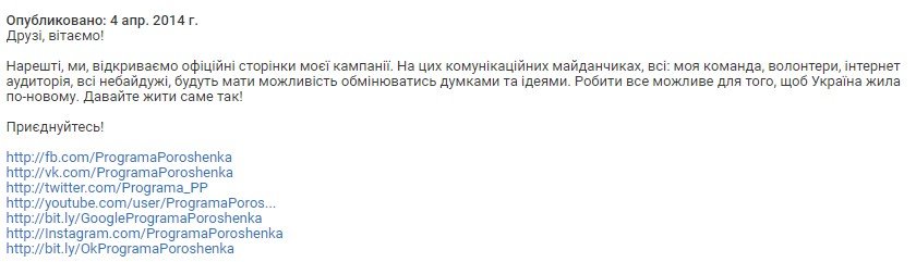 У першому відео на каналі президента "Запуск офіційних сторінок кампанії в соціальних мережах", датованому 4 квітня 2014 року, опублікований список всіх сторінок кампанії: