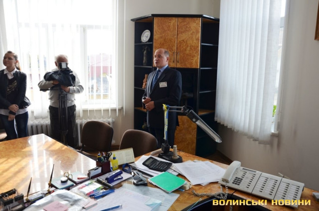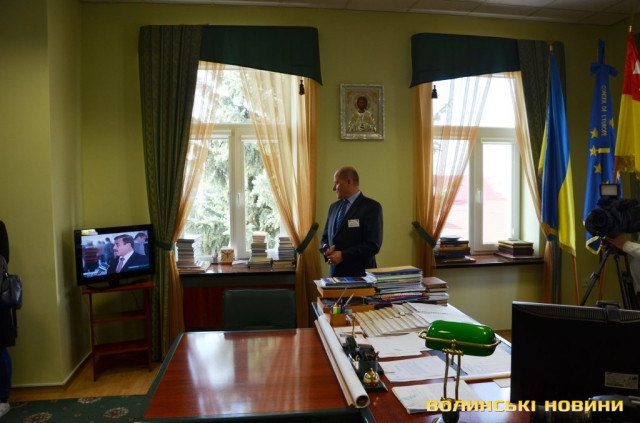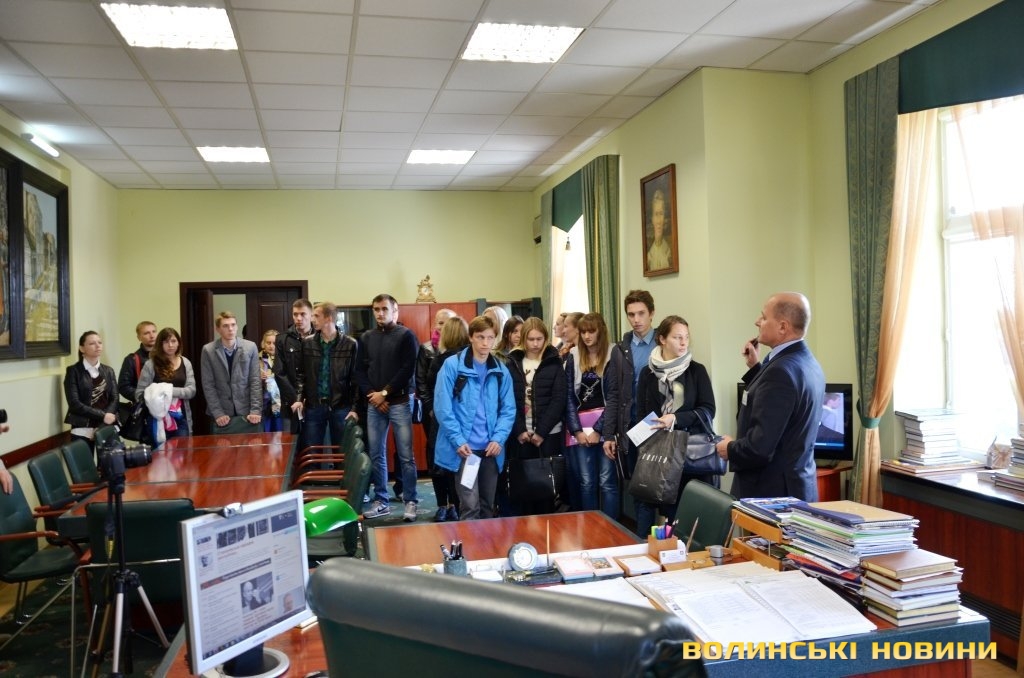 Після цього студенти оглянули кабінет міського голови. На жаль, на робочому місці Миколу Романюка застати не вдалося, адже він у цей час перебував в облдержадміністрації. Зі слів Юрія Вербича, робочий день мера закінчується, зазвичай, після 8-ї вечора. Посадовець розповів, що у містах-партнерах Луцька приміщення міськрад виглядають багатшими та запитав, чи вважають студенти, що у кабінеті потрібно здійснити капітальний ремонт. Ті відповіли, що доцільніше зробити ремонт у історичному корпусі СНУ. Студентам пропонували також посидіти у кріслі очільника міста.