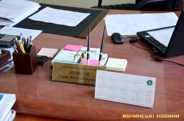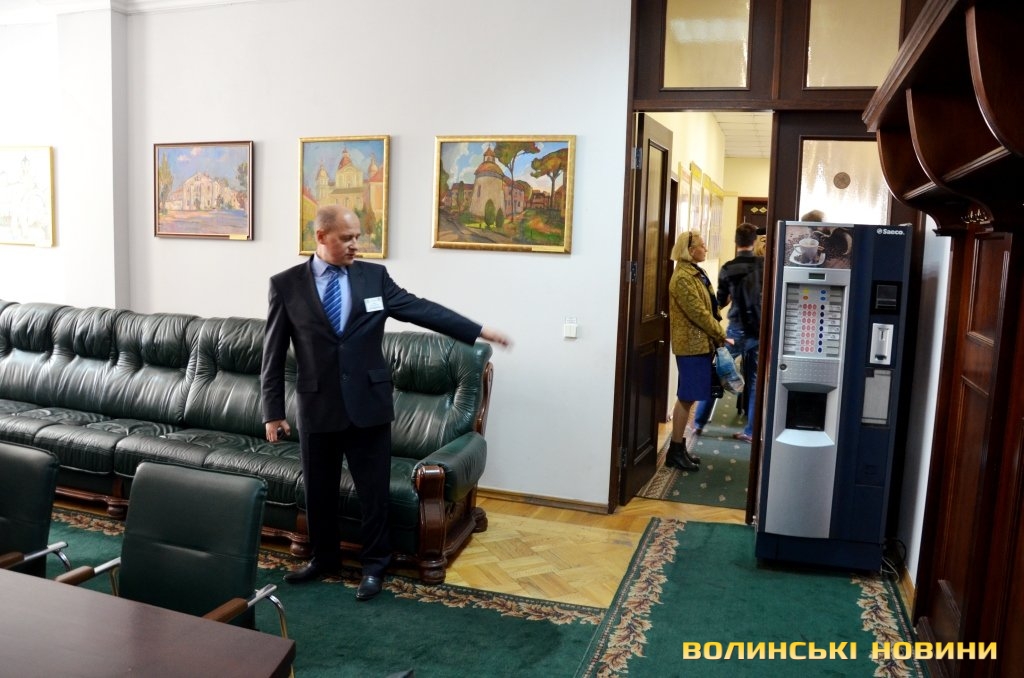У кабінеті першого заступника міського голови Святослава Кравчука Юрій Вербич розповів, що картини, які прикрашають стіни приміщення – подарунки, які свого часу отримала міськрада під час різноманітних урочистостей. З його слів, кожна з них має інвентарний номер і повинна зберігатися у будівлі міськради. Ані винести, ані продати її, відповідно до законодавства, не можна. Якщо ж працівник міськради хоче користуватися на робочому місці власними речами (наприклад, ноутбуком), потрібно укладати про це угоду з міськрадою. У кабінеті першого заступника міського голови, як розповів посадовець, вирішуються поточні питання освіти, культури, охорони здоров’я та соціального захисту.