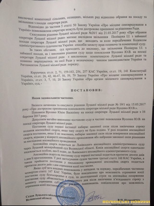 «Звільнення Поліщука І.І з займаної посади, як і виконання рішення суду щодо поновлення Вусенко Ю.В на посаді секретаря Луцької міської ради є виключно компетенцією Луцької міської ради та повинно вирішуватись на сесії Ради у визначеному чинним законодавством України та Регламентом Луцької міської ради порядку», - йдеться в офіційному документі.
