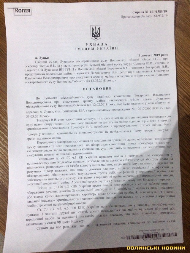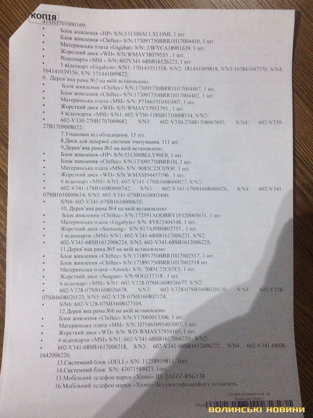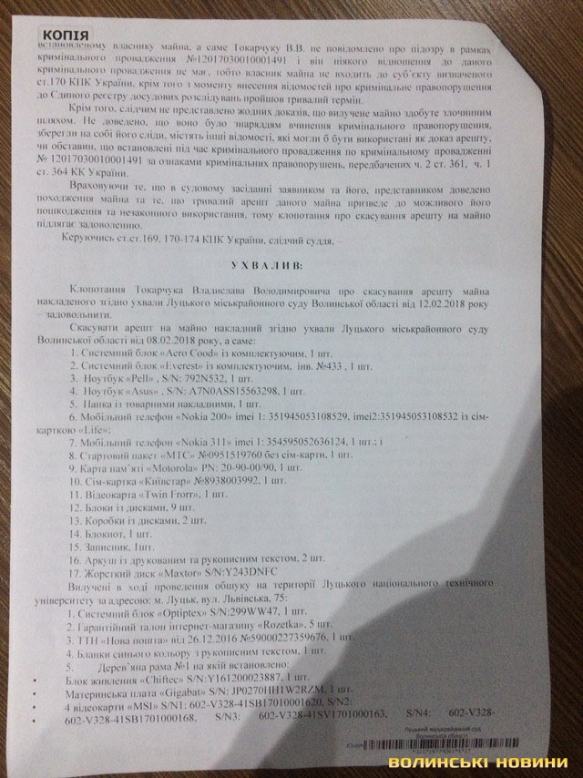 Суд вирішив задовольнити клопотання луцького майнера Владислава Токарчука та зняти арешт з його майна, тобто ферм для майнінгу криптовалюти, вартість яких на момент арешту складала 16 тисяч доларів. Своє рішення суд мотивував тим, що лучанин проходить по справі лише як свідок, і ніяка підозра йому не повідомлялася.