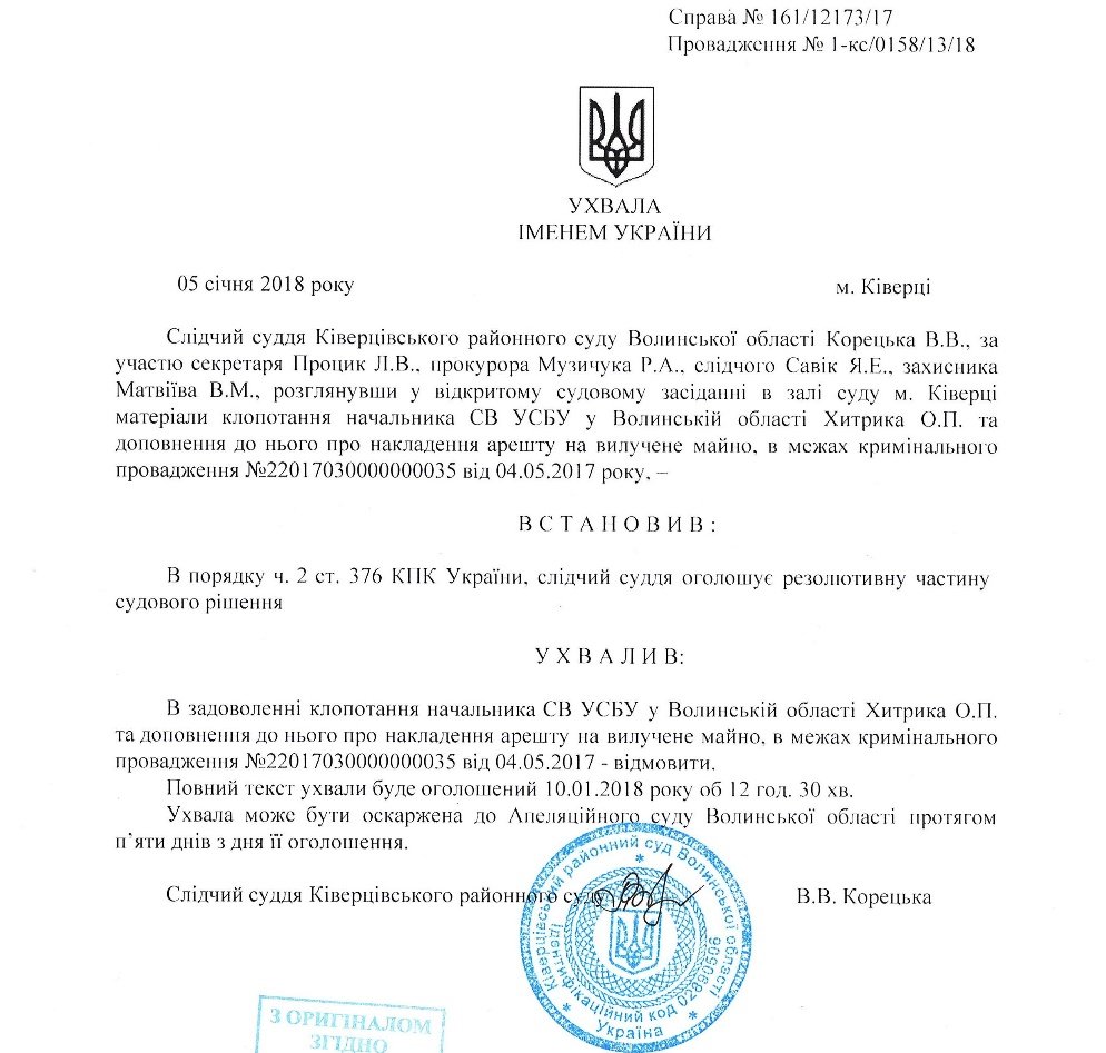 Апеляційний суд Волинської області 25 січня відмовив у задоволені апеляційної скарги прокуратури Волинської області на ухвалу слідчого судді Ківерцівського районного суду від 5 січня. Вказаною ухвалою було відмовлено в задоволенні клопотання начальника СВ УСБУ у Волинській області Олександра Хитрика та доповнення до нього про накладення арешту на вилучене в Тиводара О. О. майно в межах кримінального провадження від 4 травня 2017 року.