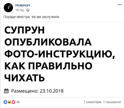 Раніше виконувач обов'язків міністра охорони і здоров'я Уляна Супрун розмістила на своїй сторінці в Facebook картинку і назвала її інструкцією по чханню.