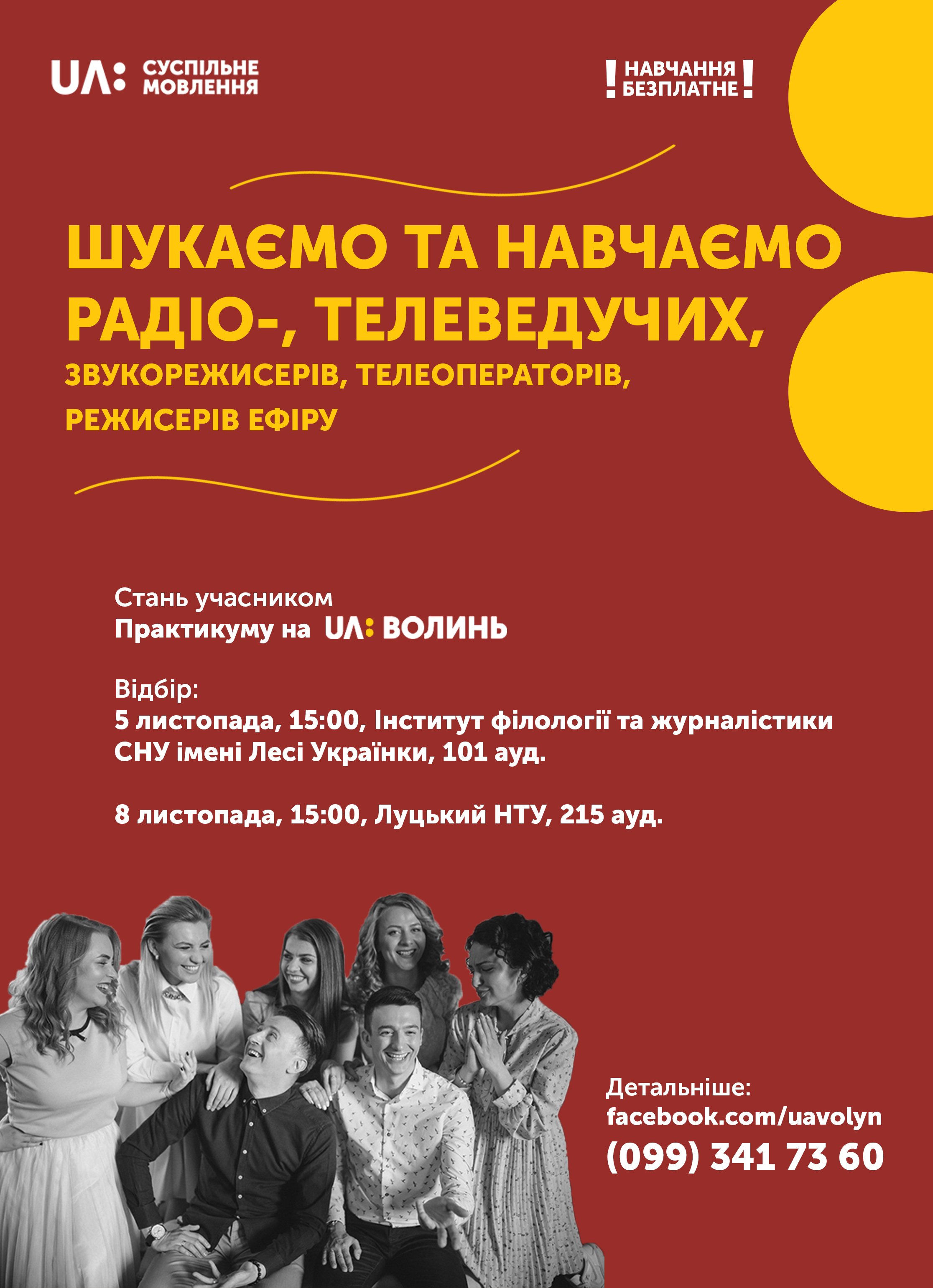 «Шукаємо для навчання радіо- і телеведучих, звукорежисерів, телеоператорів, режисерів ефіру!» - з таким закликом цієї осені стартує кастинг на навчання в проекті «Практикум на UA:ВОЛИНЬ».