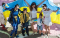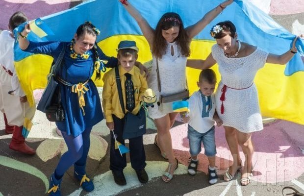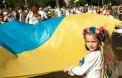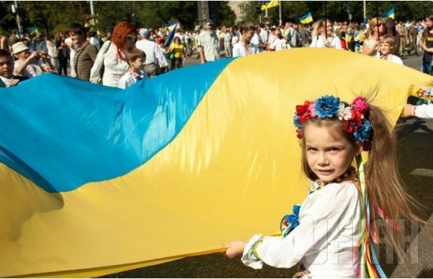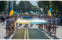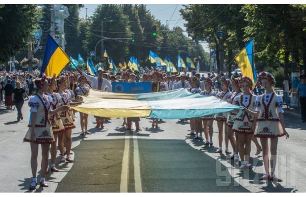 Житомир. На ходу в День Незалежності тут зібралася майже тисяча містян. Розгорнули 15-метровий прапор. З ним і рушили на центральний майдан. Тут на розмальованій карті України діти стали у живий ланцюг по кордонах. Цим символізували цілісність і неподільність країни.