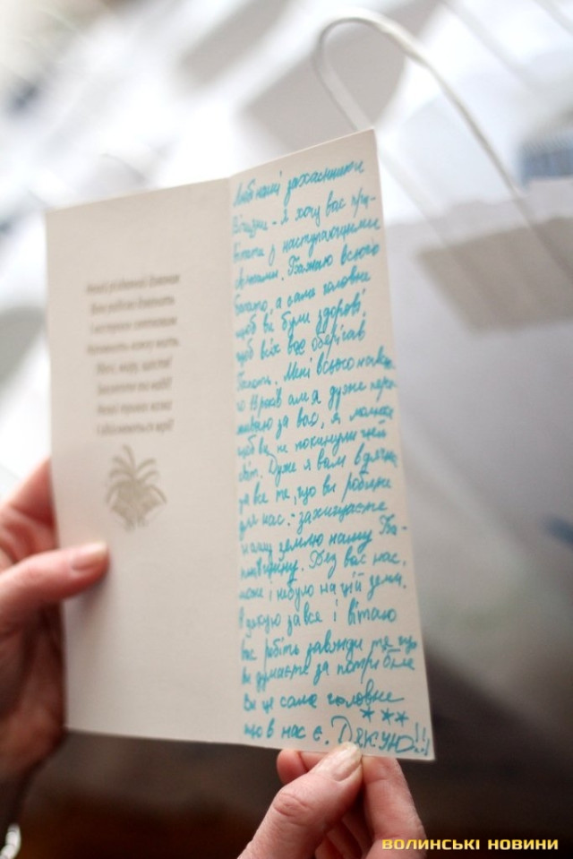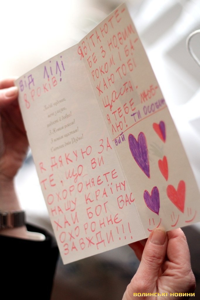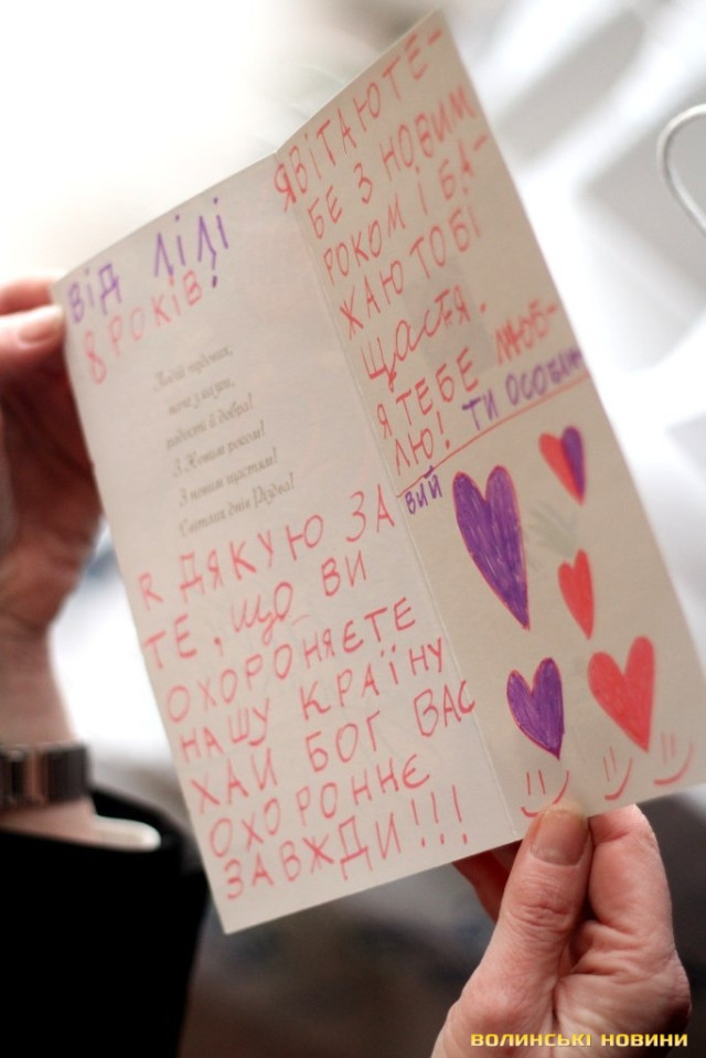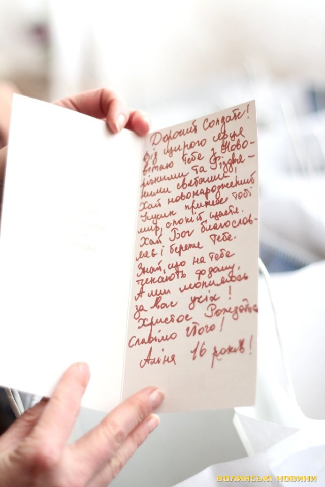 «Дорогий солдате, незабаром будуть новорічні свята – Новий рік та Різдво, тому я хочу тебе привітати, побажати щастя, здоров’я, а головне, щоб ти зустрів ці свята у колі своєї родини. З любов’ю, Катруся із Луцька. Дорогі воїни! Не здавайтеся, боріться за нашу Неньку-Україну, будьте сильними, чесними, і тоді Бог допоможе і буде все добре. Бажаю, щоб ти перемагав, долав усі перешкоди, ніколи не програвав, а просто вірив у себе. Я тобі бажаю щастя і многії-многії літа. З Різдвом Христовим, від Мар’янки та Артема», - процитувала Ірина Констанкевич листівки від луцьких школярів.