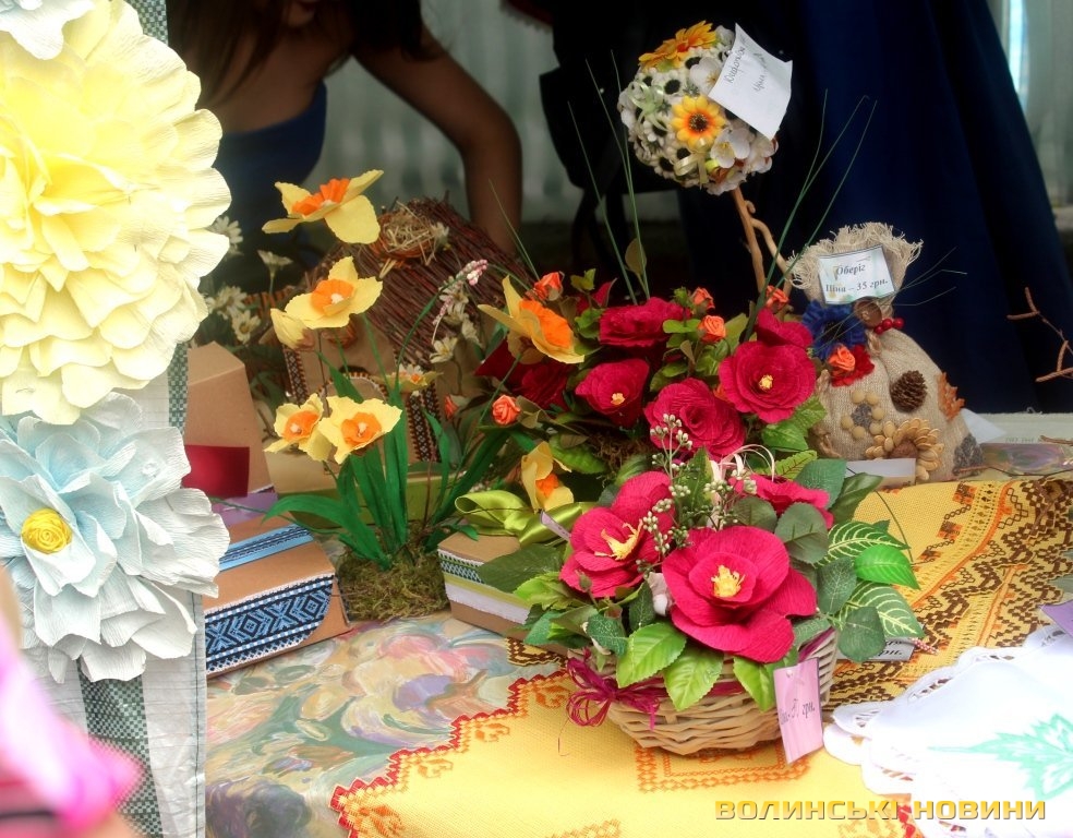 Студент першого курсу ДПМ Луцького ВПУ будівництва та архітектури Дмитро Цимбалюк розповів, що у рамках ярмарку представляють роботи з художньої кафедри мистецтв, відділу кераміки, виробництва художніх виробів з дерева, художні роботи та столярні вироби. Найбільшим попитом, з його слів, сьогодні користуються речі, що мають практичне застосування, наприклад різноманітний посуд.Майстер виробничого навчання професії електрогазозварник Нововолинського ПТУ №11 Тарас Снігарук повідомив, що сьогодні на виставку привезли мангали та інші металеві вироби, які власними руками виготовили студенти навчального закладу. Найпопулярнішими серед них є знаряддя сільського господарства, а також шампури, адже нині чимало волинян збираються на відпочинок на природі. Кулінарні вироби (торти, пиріжки, рулети) під час ярмарку розкупили за лічені години. Цьогоріч у навчальний заклад набиратимуть на базі 11-го класу на спеціальності продавців, зварників та кухарів, продавців, верстатників, електрогазозварників на базі 9-го класу.Представники Технічного коледжу ЛНТУ презентували вироби студентів та учнів, виготовлені під час уроків виробничого навчання. Це продукція спеціальності «швачка-вишивальниця», постільна білизна, а також продукція флористики, вишивка, продукція спеціальності «дизайн картини». Для усіх охочих проводили майстер-класи з флористики та виготовлення листівок. Як пояснила заступник директора з навчально-виховної роботи Ірина Свірська, усі отримані кошти відправлять бійцям АТО.Майстер виробничого навчання Маневицького професійного ліцею Людмила Солобчук розповіла, що заклад виробляє здебільшого продукцію з деревини, зокрема меблі, аби завоювати ринок. Під час ярмарку ця продукція користується попитом, адже використовують натуральну деревину, що забезпечує відмінну якість.
