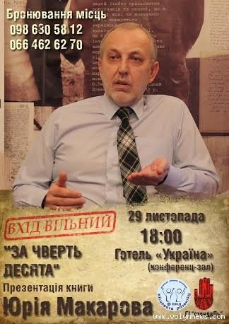 Так, 29 листопада, о 18:00, у готелі «Україна» (великий конференц-зал, вулиця Словацького, 2) відбудеться творча зустріч із відомим журналістом, телеведучим та письменником Юрієм Макаровим.