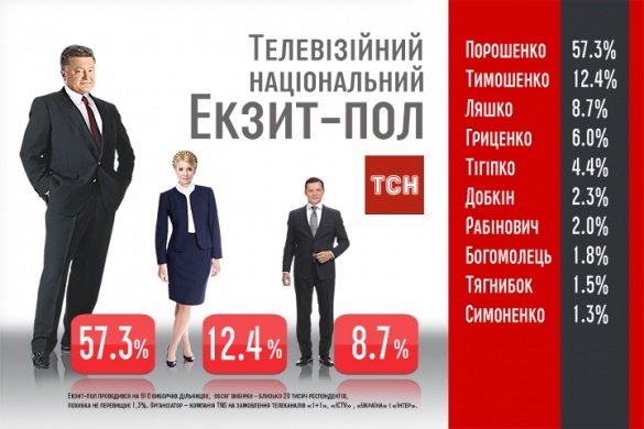 Згідно з даними телевізійного екзит-полу Петро Порошенко стане президентом у першому турі. Юлія Тимошенко та Олег Ляшко посіли друге і третє місце відповідно. Так, згідно з цими даними, Порошенко отримав 57,3% голосів. Це означає, що другого туру президентських виборів не буде. Другою до фінішу прийшла Юлія Тимошенко з результатом у 12,4%. Третє місце сенсаційно посів Олег Ляшко, набравши 8,7% голосів українців, - інформує ТСН.