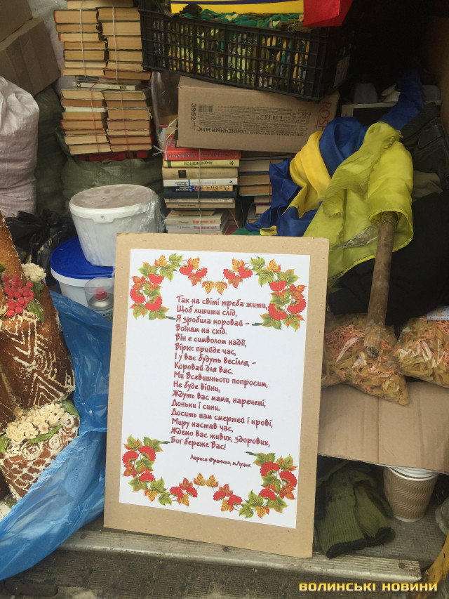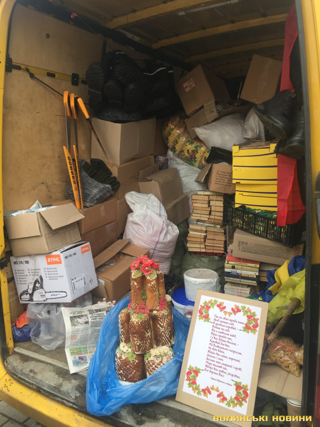 «Наближається зима, тому веземо вживаний брезент, мінвату, теплі речі, буржуйки, а також автомобільні запчастини. На сході багато наших, луцьких і волинських, хлопців служать, але ми нікого не забуваємо, адже всі вони захищають нашу Україну. Тож ми не розділяємо їх, залежно від того, хто з якого міста чи області. Усі вони – одне ціле», – наголосив Сергій Балицький.Бібліотекар Волинської обласної бібліотеки для юнацтва, керівник творчої майстерні «Навчись» Оксана Коба розповіла, що вже три роки діти, які відвідують бібліотеку, виготовляють сувеніри та обереги для військовослужбовців.