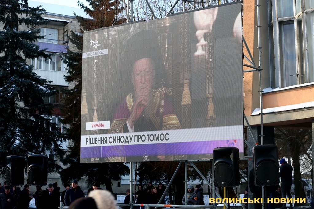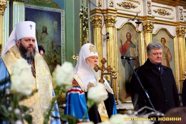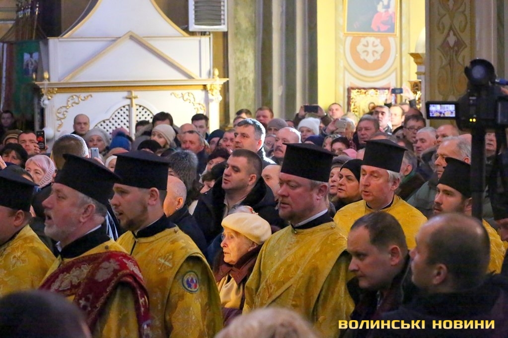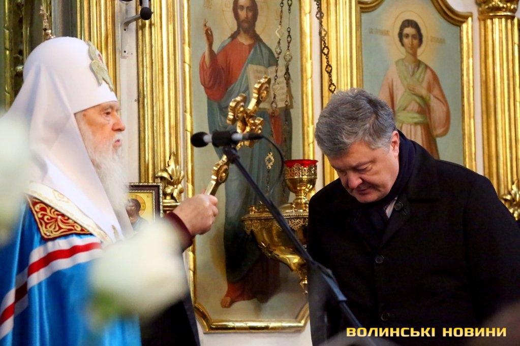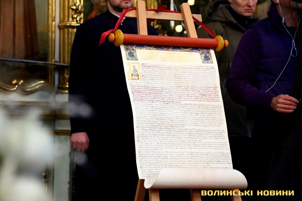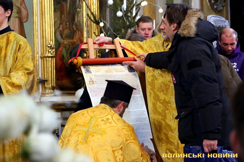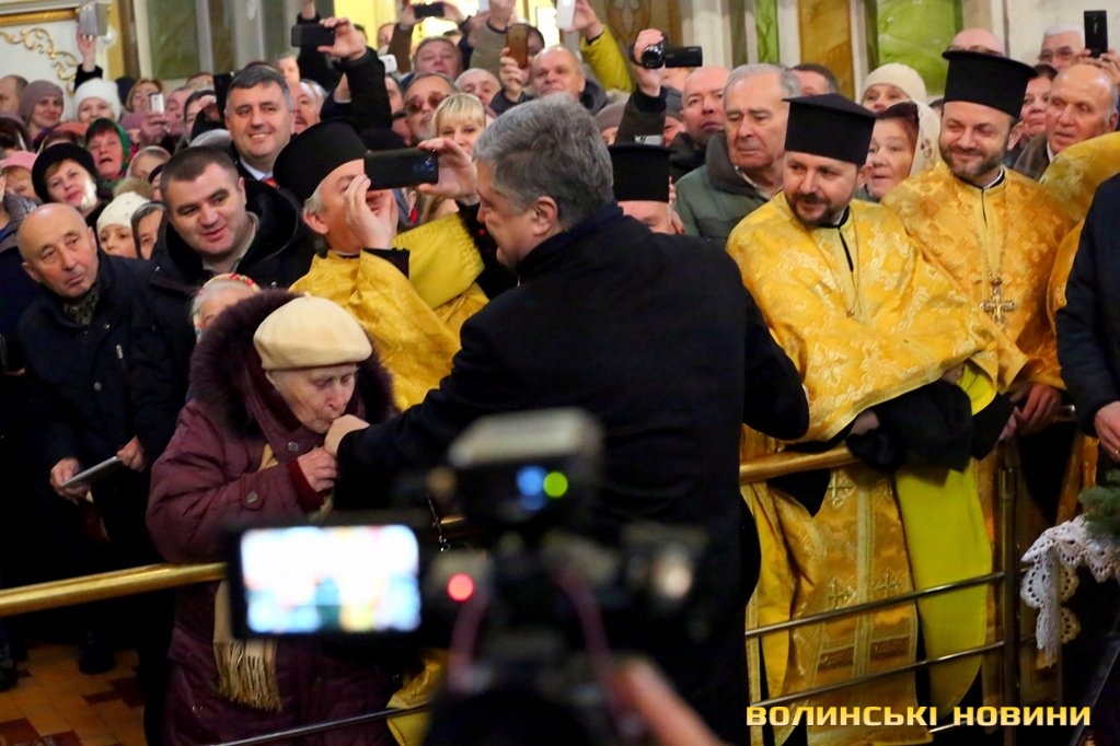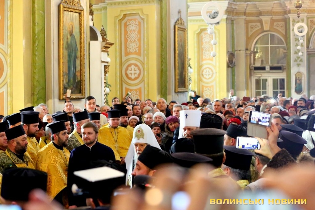 Однак, пробравшись крізь натовп з головою ОДА Олександром Савченком, президент вже був у Соборі. Зауважимо, що гаранта зустріли дуже тепло, а окремі прихожани навіть цілували йому руки. Також поблизу входу до вівтаря на заздалегідь розміщеній тринозі встановили Томос про автокефалію, на якому Порошенко акцентував свою основну увагу в промові після богослужіння.Однак першим до присутніх у соборі лучан звернувся Філарет, який зазначив, що Україна 25 років чекала надання Українській православній церкві автокефалії: «Багато років ми чекали того моменту, коли вселенський патріарх Варфоломій надасть нам Томос про автокефалію... Ми дякуємо Богу за те, що надав нам незалежність і створив умови для того, аби вселенський патріарх зважився на цей крок, усупереч Москві».