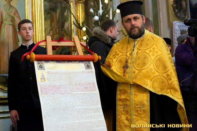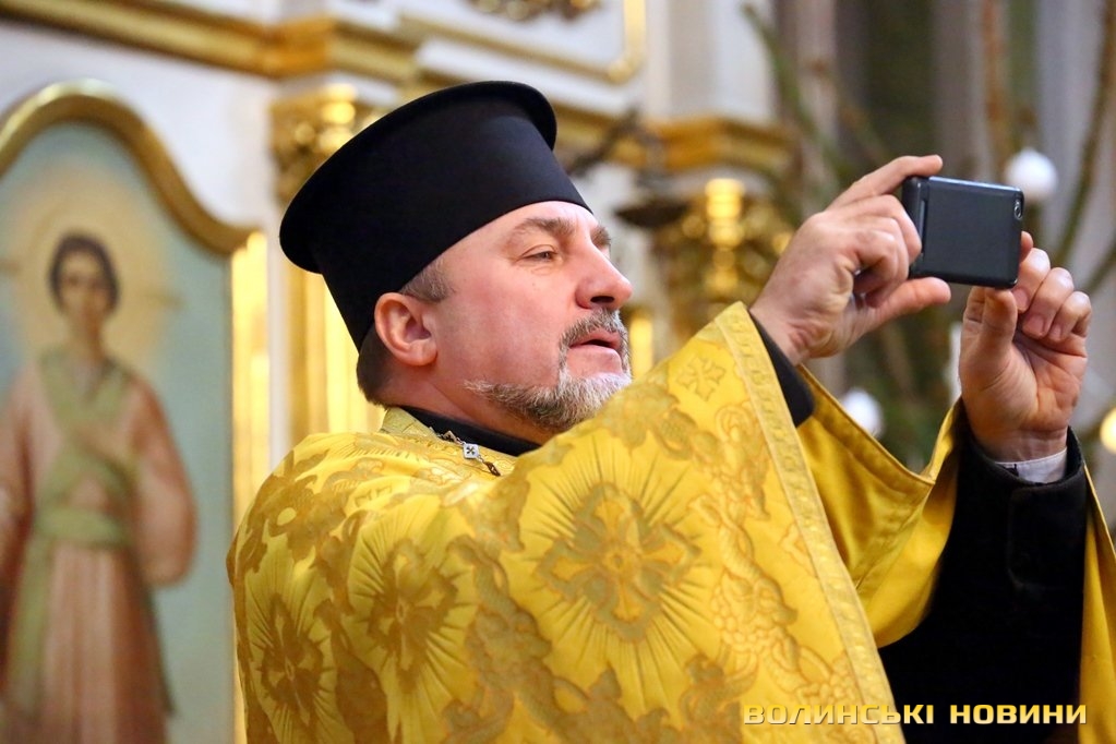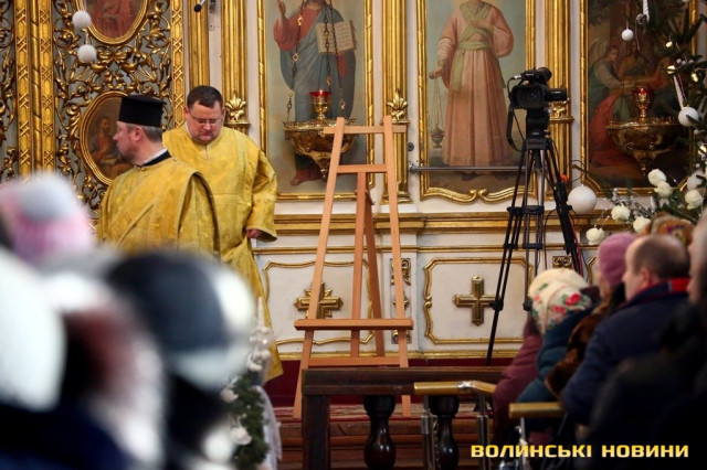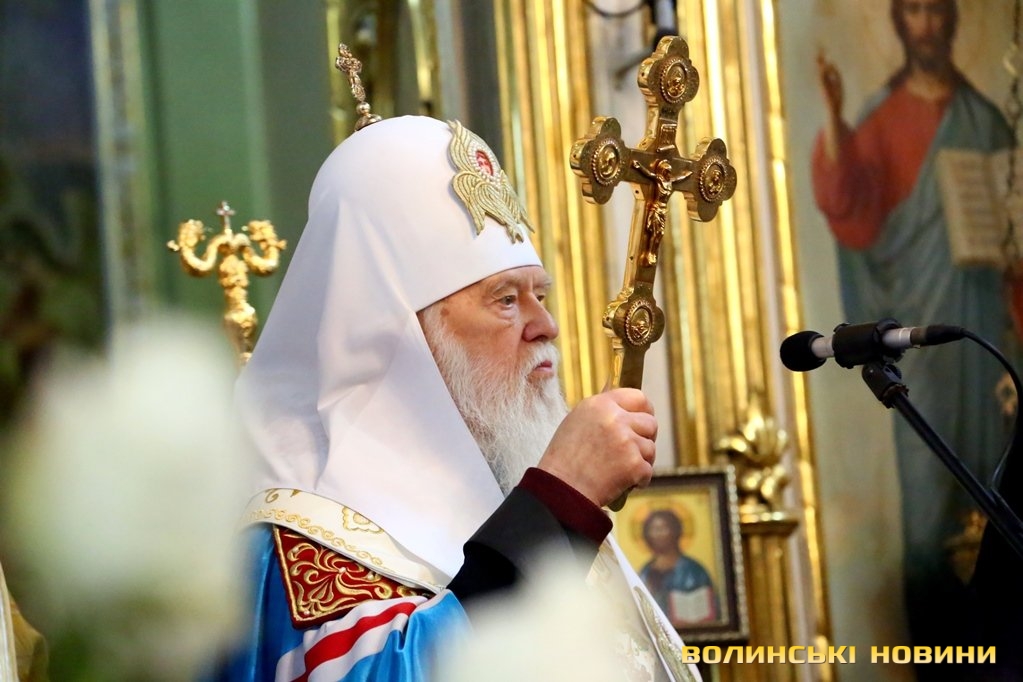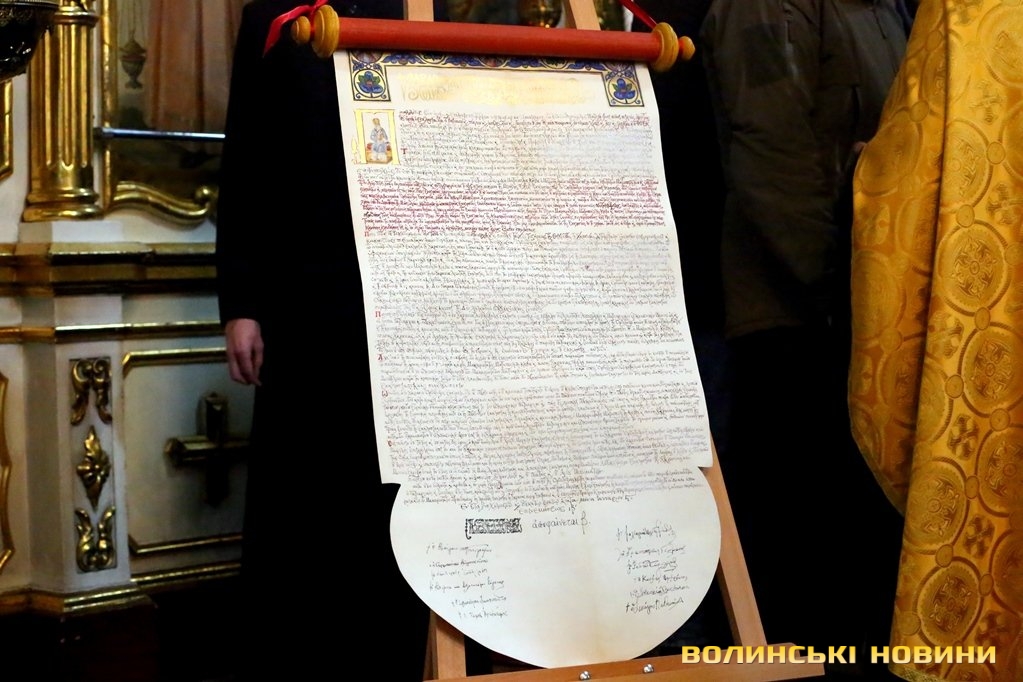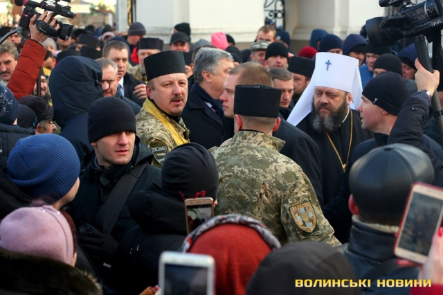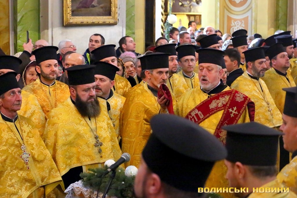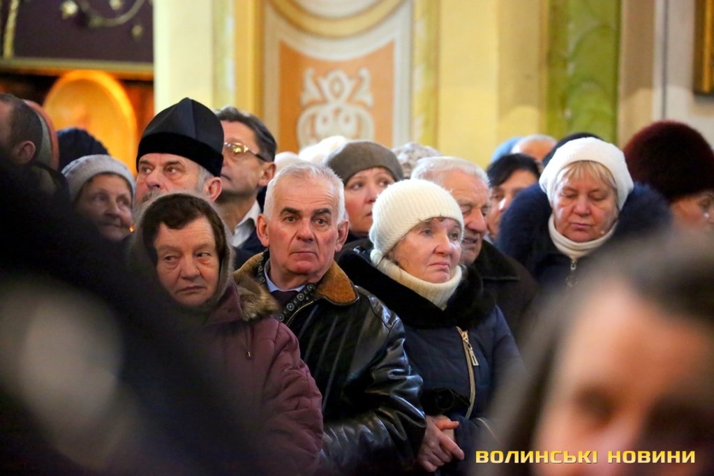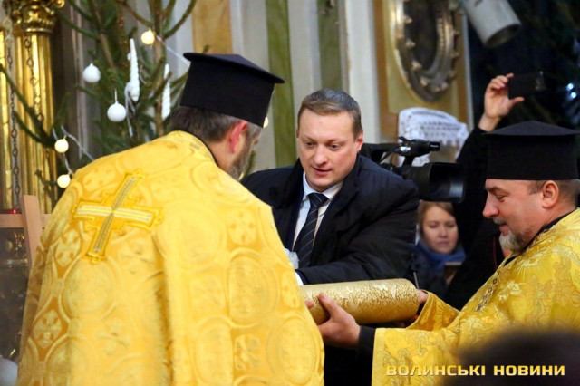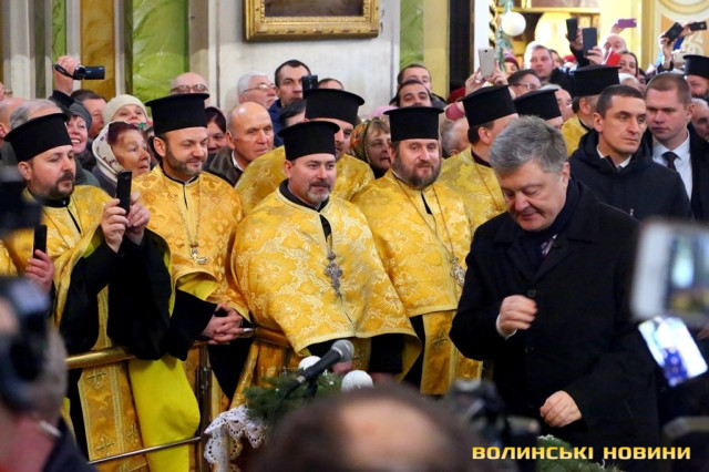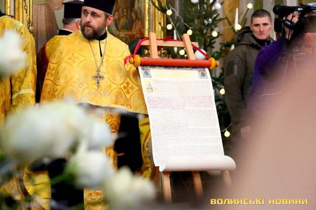 Однак, пробравшись крізь натовп з головою ОДА Олександром Савченком, президент вже був у Соборі. Зауважимо, що гаранта зустріли дуже тепло, а окремі прихожани навіть цілували йому руки. Також поблизу входу до вівтаря на заздалегідь розміщеній тринозі встановили Томос про автокефалію, на якому Порошенко акцентував свою основну увагу в промові після богослужіння.Однак першим до присутніх у соборі лучан звернувся Філарет, який зазначив, що Україна 25 років чекала надання Українській православній церкві автокефалії: «Багато років ми чекали того моменту, коли вселенський патріарх Варфоломій надасть нам Томос про автокефалію... Ми дякуємо Богу за те, що надав нам незалежність і створив умови для того, аби вселенський патріарх зважився на цей крок, усупереч Москві».