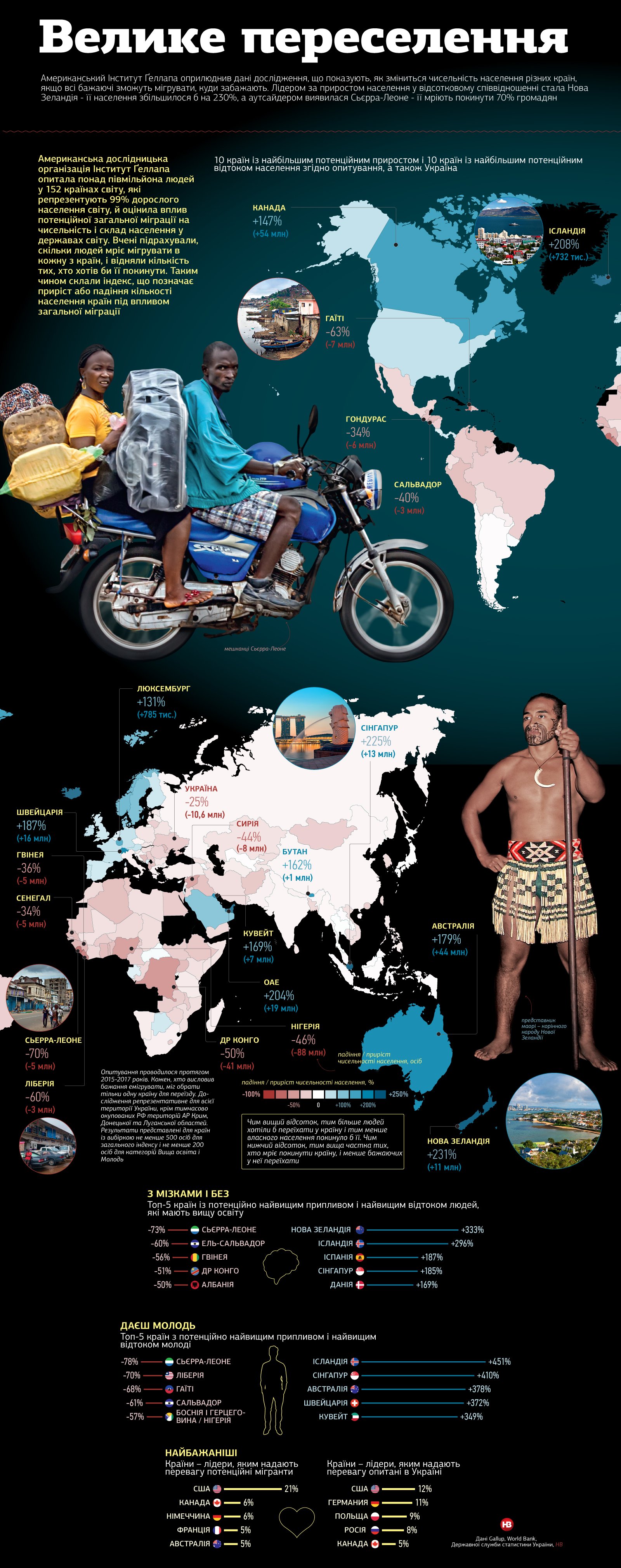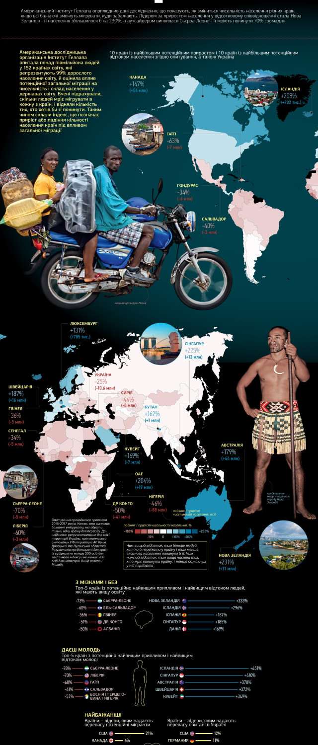Лідером за приростом населення в процентному співвідношенні стала Нова Зеландія – її населення збільшилося б на 230%, а аутсайдером виявилася Сьєрра-Леоне – її мріють покинути щонайменше 70% мешканців.