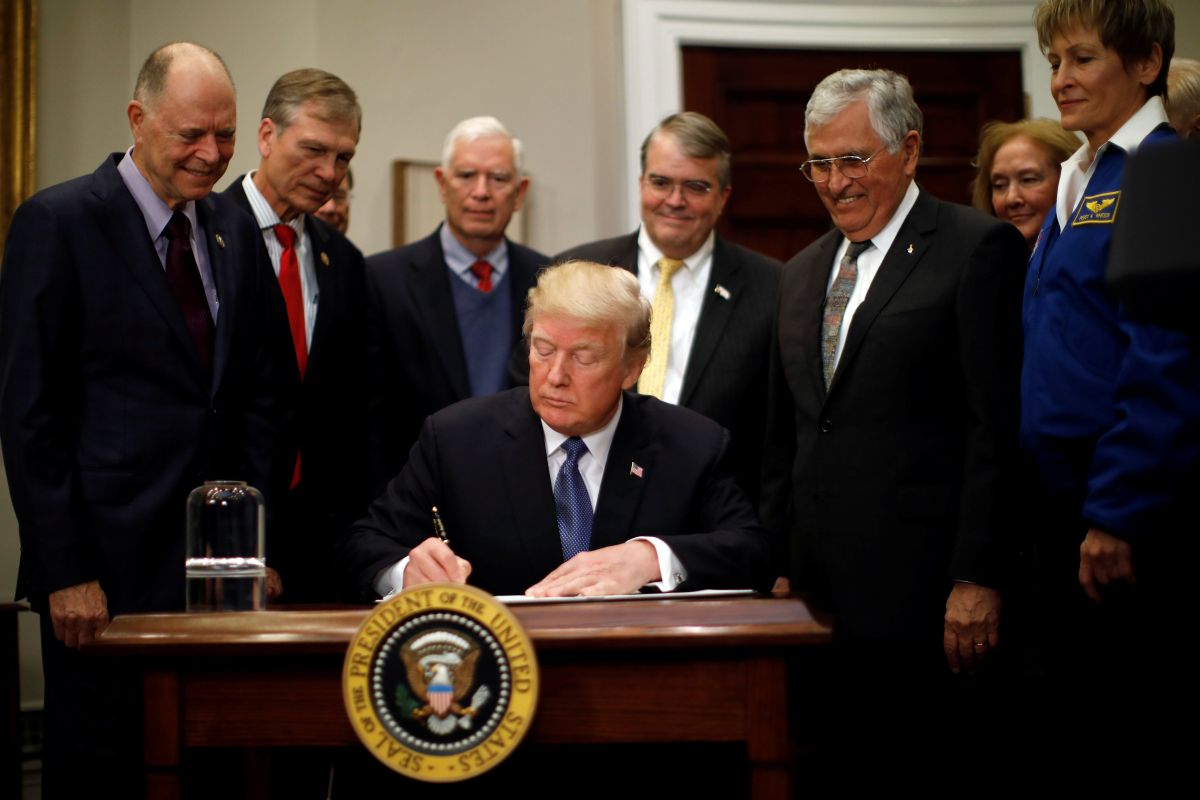 Зробив він це у присутності астронавтів, в тому числі останнього, хто побував на Місяці – Харрісона "Джека" Шмітта. Підписання меморандуму було приурочено до річниці місії, в якій брав участь Шмітт, коли люди в 1972 році в останній раз побували на Місяці.