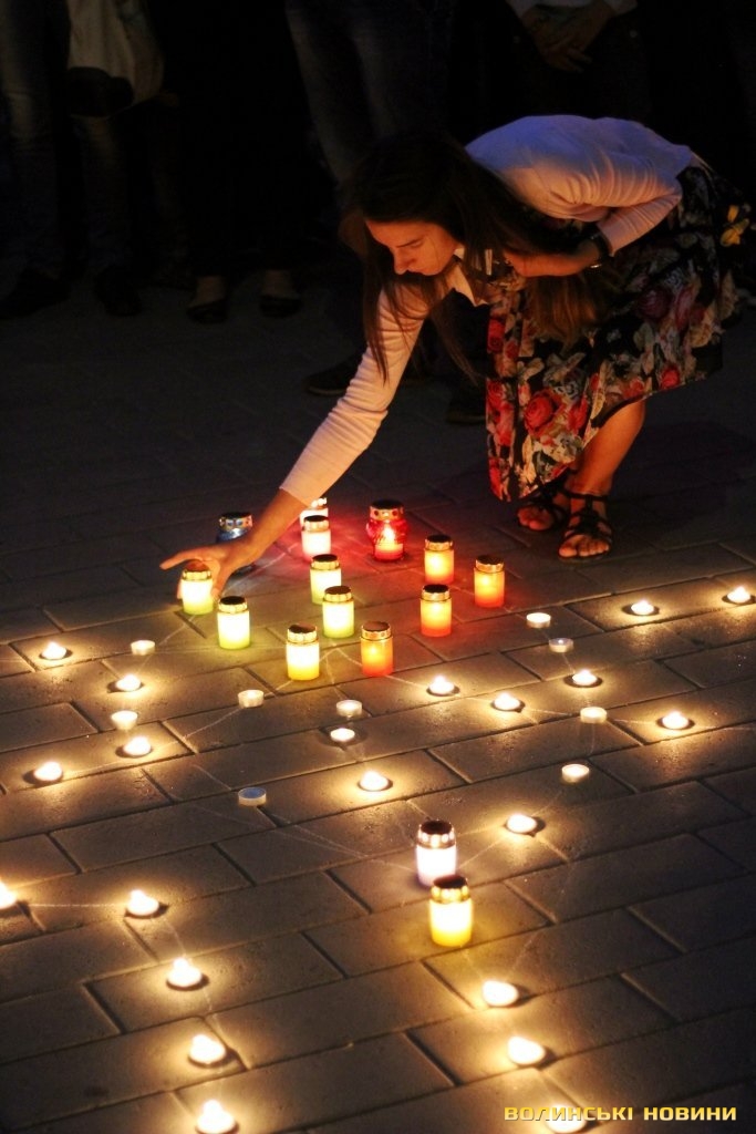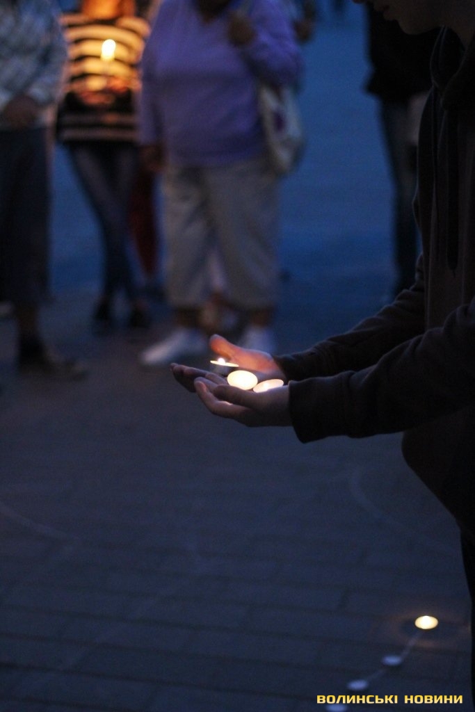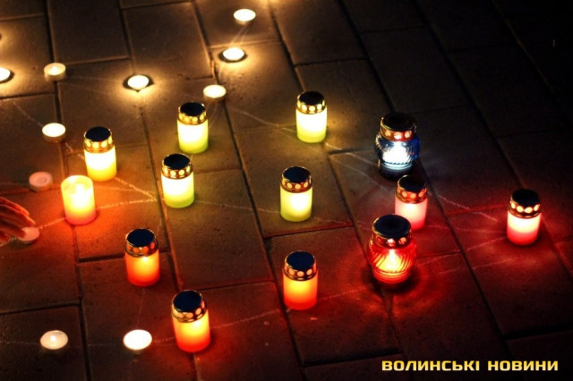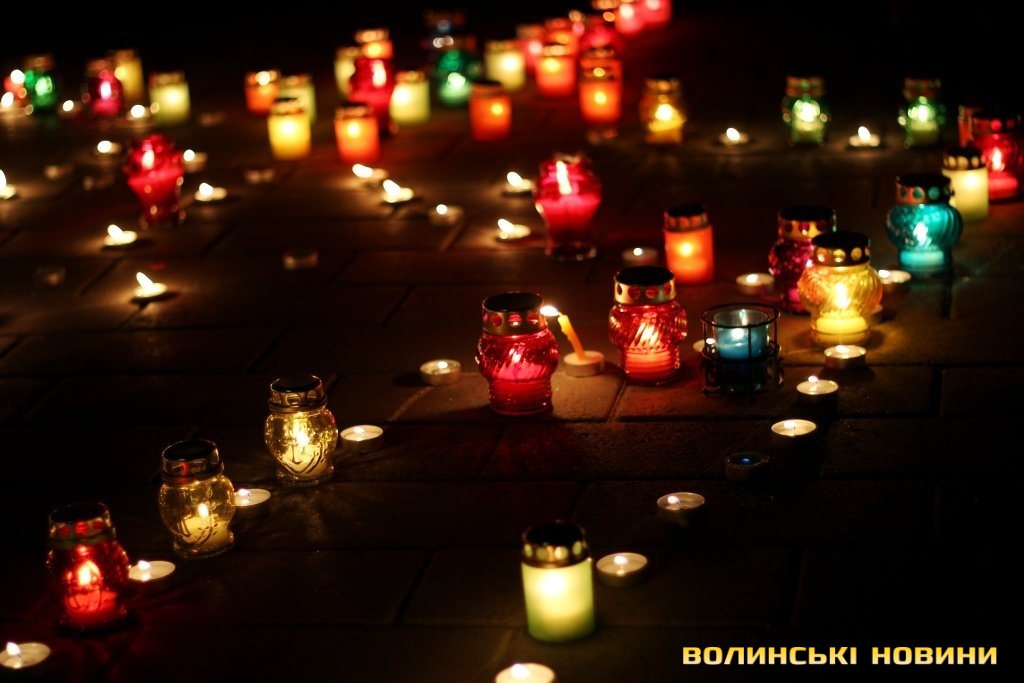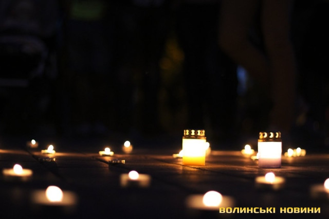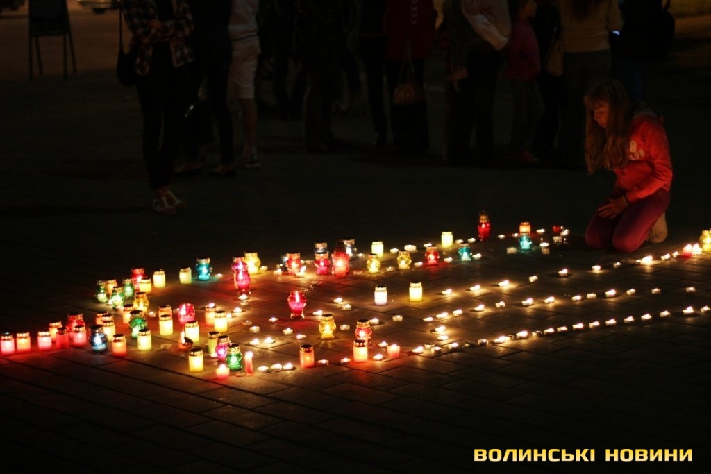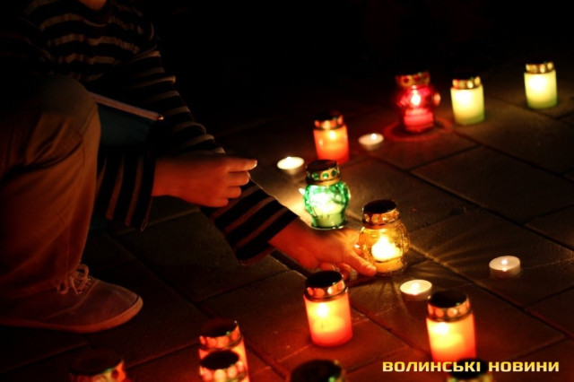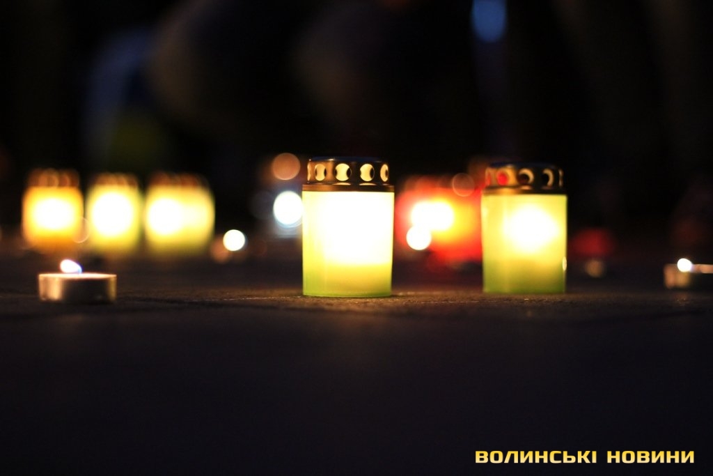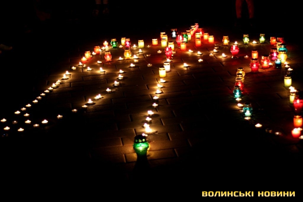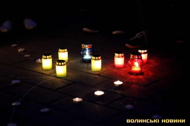 На честь полеглих за незалежність України тризуб зі свічок та лампадок запалили у центрі Луцька.
