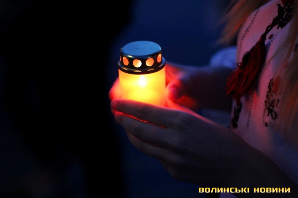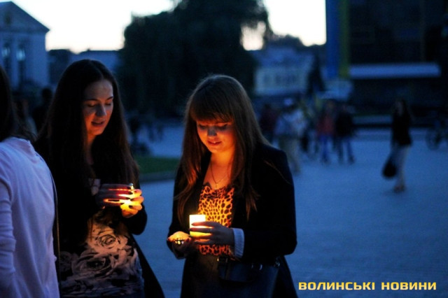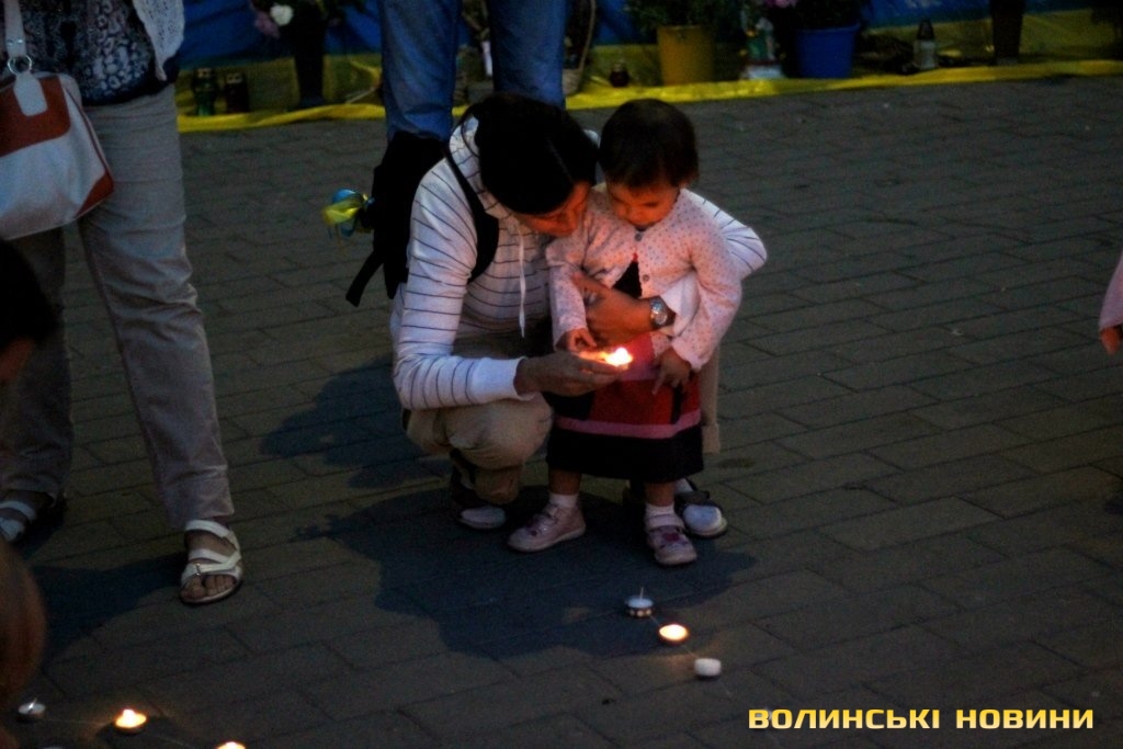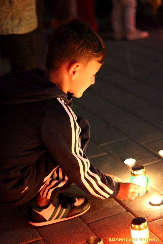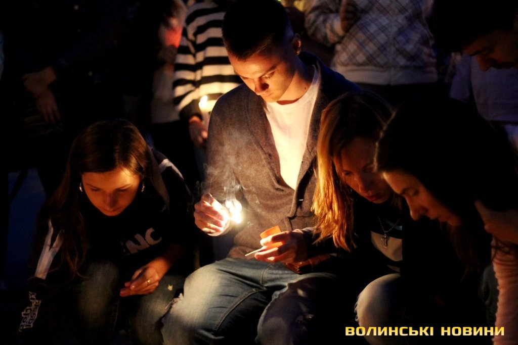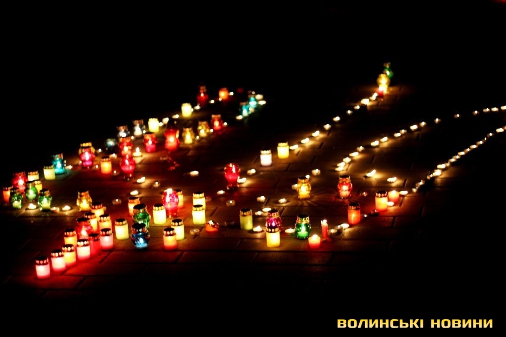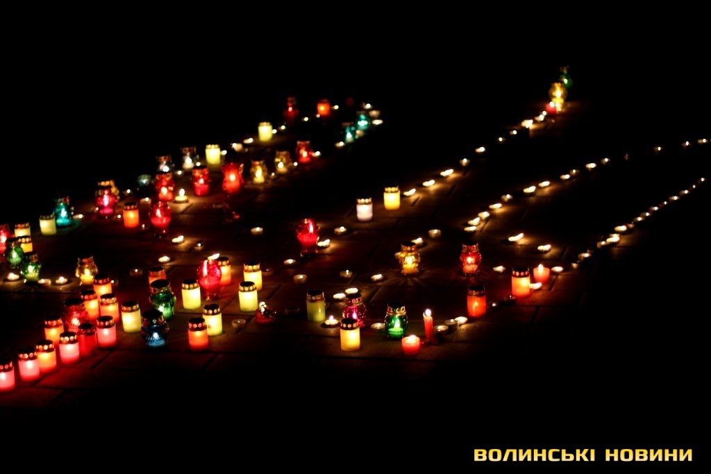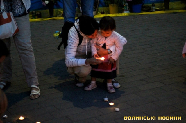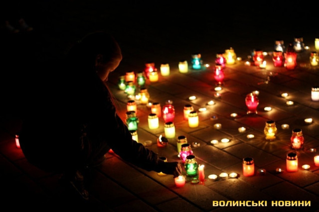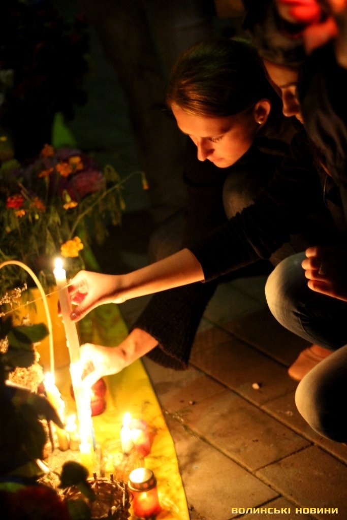 На честь полеглих за незалежність України тризуб зі свічок та лампадок запалили у центрі Луцька.