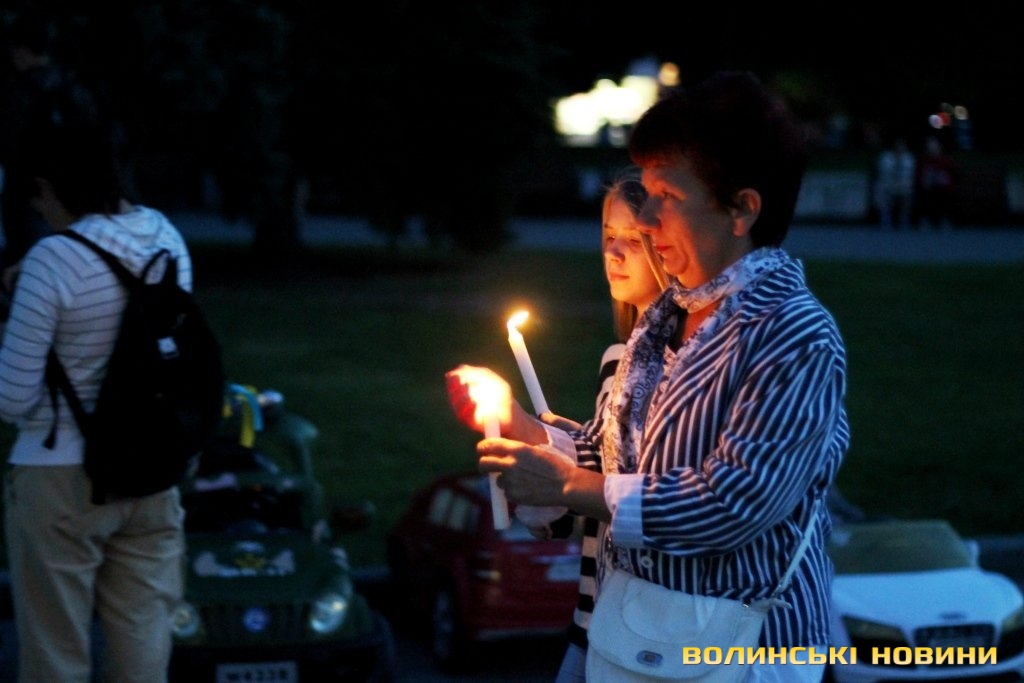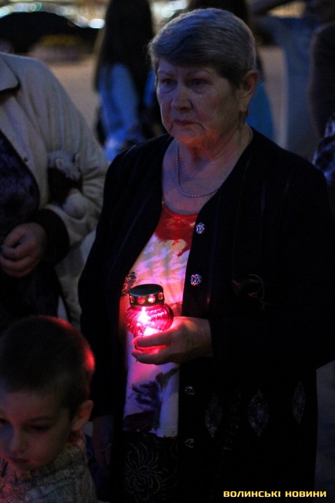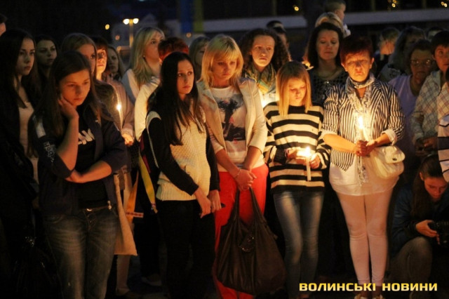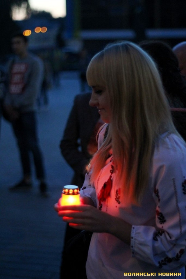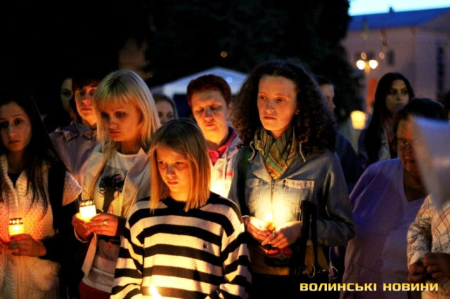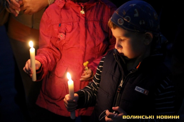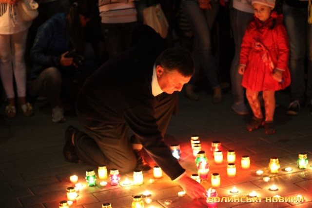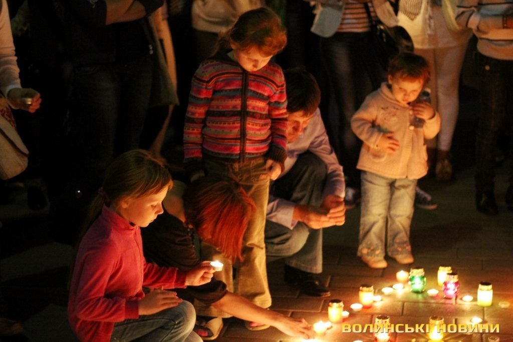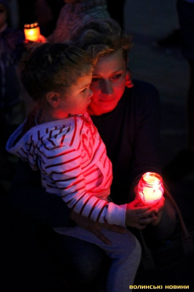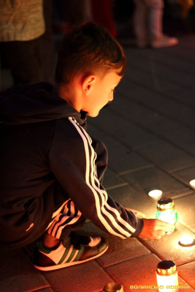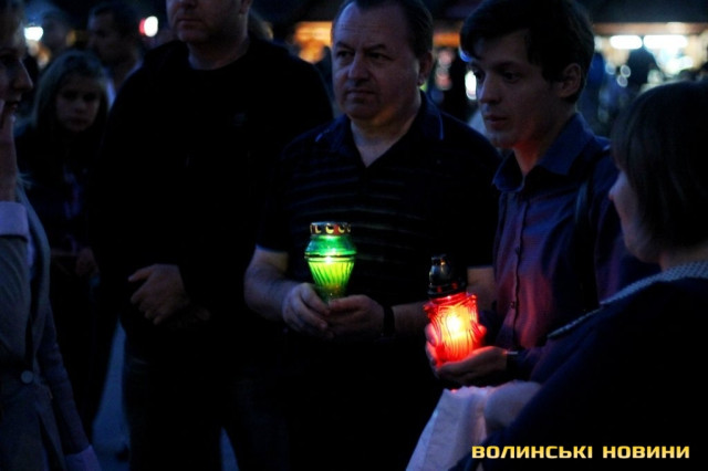 На честь полеглих за незалежність України тризуб зі свічок та лампадок запалили у центрі Луцька.