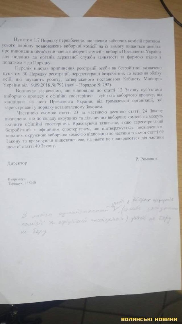 Зокрема, жителі Ратнівщини повідомили, що під час спілкування із працівниками центру зайнятості останні вимагали письмову розписку про те, що особа не бере участі у виборах Президента України в якості голови, заступника, секретаря чи члена виборчої комісії, а також офіційного спостерігача.